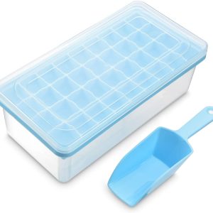 Bandeja de cubitos de hielo con tapa y cubo – Bandeja de hielo de silicona para congelador | Viene con contenedor de hielo, cuchara y tapa | Hielera de buen tamaño (azul)