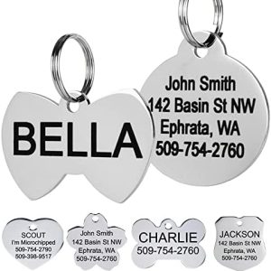 Etiquetas de identificación de Pets de acero inoxidable GoTags, etiquetas personalizadas para perros y gatos, hasta 8 líneas de texto personalizado, grabadas en ambos lados, en hueso, redondas, con forma de corazón, con pajarita y más