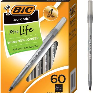 Bolígrafo BIC Round Stic Xtra Life, punta media (0.039 in), negro, cilindro redondo flexible para comodidad de escritura, 60 unidades (el embalaje puede variar)