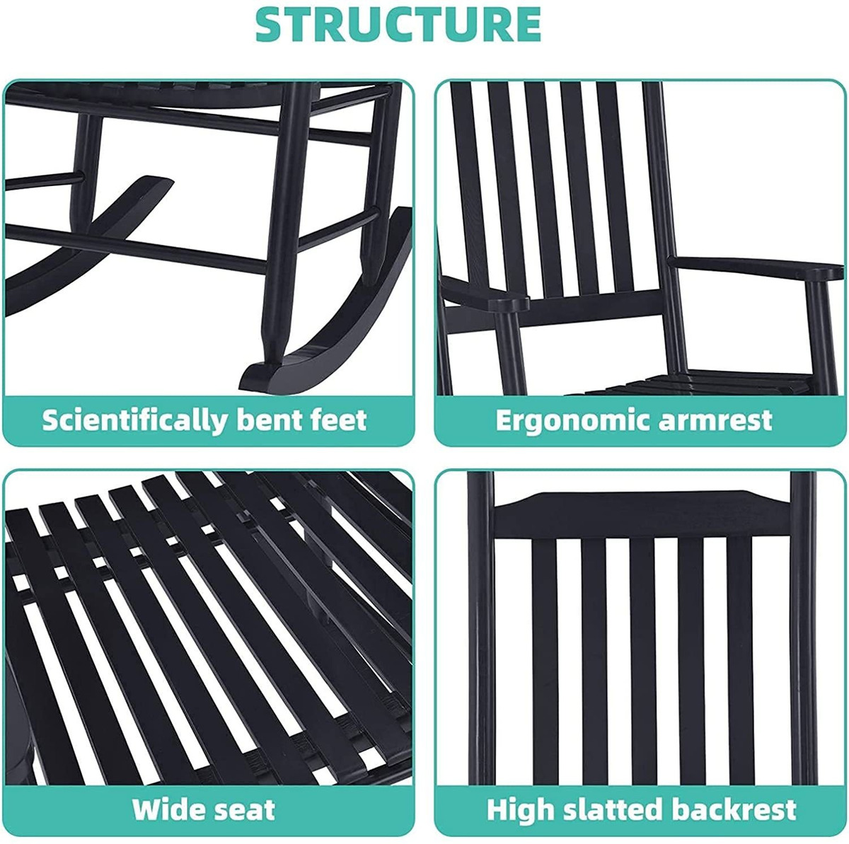 Bienvenido–Mis clientes leales, bienvenidos a hacer clic para comprar esta mecedora para exteriores (modelo de adulto), bienvenidos a consultar cualquier pregunta sobre nuestros productos, y estamos encantados de responderte.; Madera de pino maciza, cómoda y respetuosa con el medio ambiente– Esta silla mecedora de camping está hecha de madera de pino maciza seleccionada. Por un lado, las sillas mecedoras de madera son más amigables con la piel humana que el arte de hierro, y no hay necesidad de preocuparse por el óxido. Esta silla ha pasado la certificación de fábrica para garantizar que el embalaje es seguro para su uso.; Diseño ergonómico aerodinámico– Esta mecedora para exteriores adopta un diseño aerodinámico de estructura de listones. Por un lado, combina el rango de oscilación de la posición sentada para miles de personas para garantizar su experiencia cómoda; por otro lado, puede promover eficazmente la disipación del calor. Los reposabrazos anchos y el respaldo alto pueden apoyar fácilmente tus brazos y espalda.; Diseño impermeable, fácil de limpiar–La superficie del cuerpo de la silla mecedora de madera está hecha de poliuretano de doble capa, que es impermeable y suave, sin rebabas, y tiene una estructura estable. La apariencia de la silla se puede mantener utilizando un cepillo.; Instalación fácil y rápida y 100% post-venta: esta mecedora viene con instrucciones claras y concisas para facilitar su instalación rápida. Nuestra prioridad es tu máxima satisfacción. Haremos todo lo que se necesite para garantizar que tengas una gran experiencia de compra. Por favor, póngase en contacto con nosotros en caso de cualquier problema relacionado con el pedido para un servicio al cliente rápido y sin complicaciones. Color:Negro | Tamaño:1pc(41.34inch)