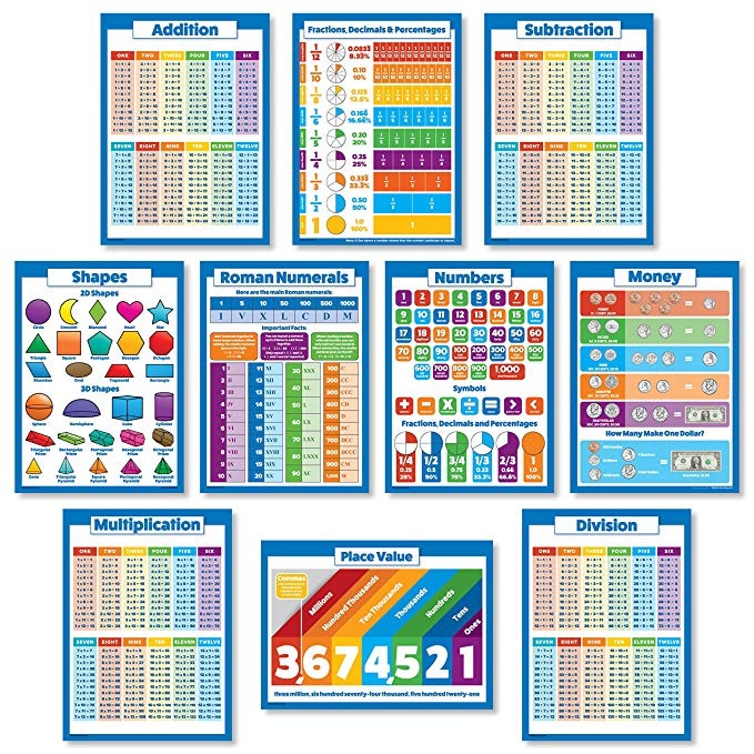 10 LAMINADO Educación Matemáticas pósters para Niños – Tabla de multiplicación, división, suma, resta, números 1-100 +, formas en 3D, fracciones, decimales, porcentajes, números romanos, Valor posicional, dinero Todos nuestros productos estan en inglés SKU 27061901313