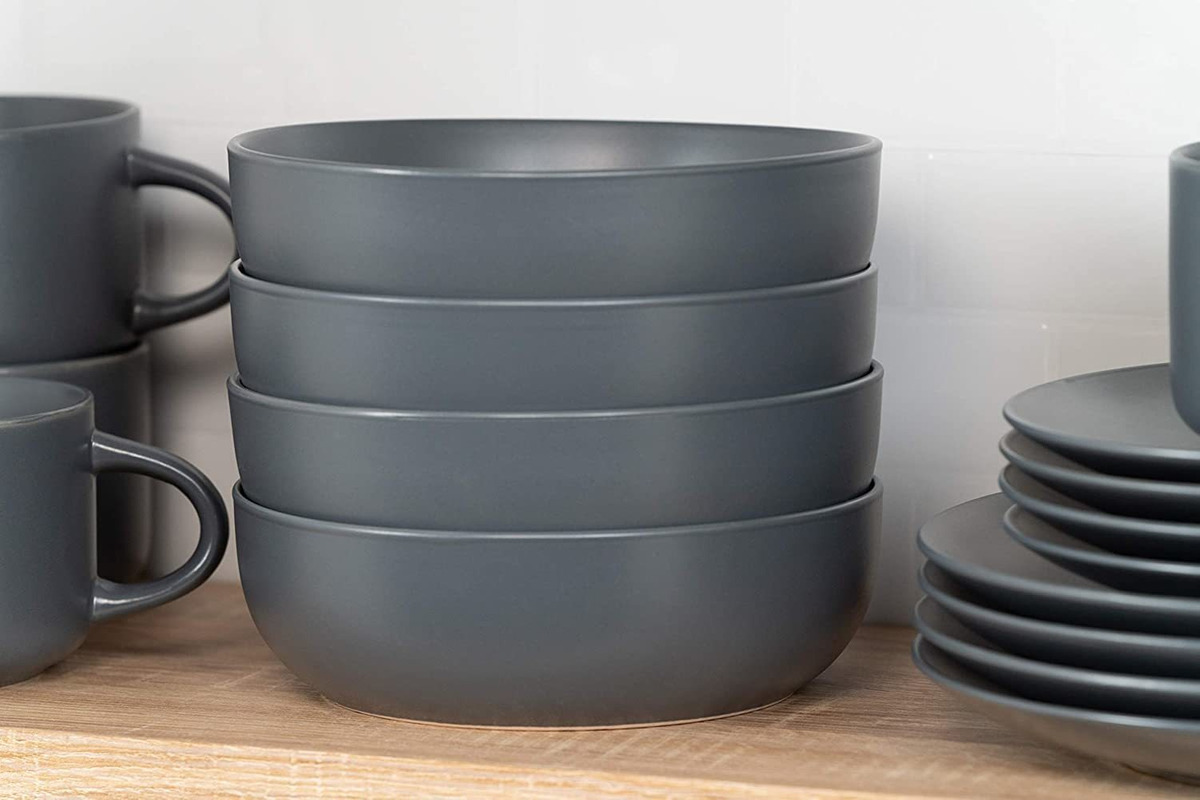Moderno, minimalista, y mate, esta colección de cupé de gran tamaño cuenta con tazas de 22.0 fl oz y cuencos de 31.8 fl oz para acomodar comidas o recetas de cuencos convenientes. Con curvas suaves y bordes elegantes, este juego es perfecto para entretener o relajarse en casa.; Servicio para 4 este juego incluye: platos llanos de 10.5 pulgadas, platos de ensalada de 8.25 pulgadas, cuencos de 32 oz/7.5 pulgadas, y taza de 22 oz de gran tamaño; Taza de gran tamaño también es ideal para sopas y cereales; Apto para microondas y lavavajillas; Mientras que los platos son aptos para microondas, pueden calentarse. Manejar con cuidado. Color:Gris carbón