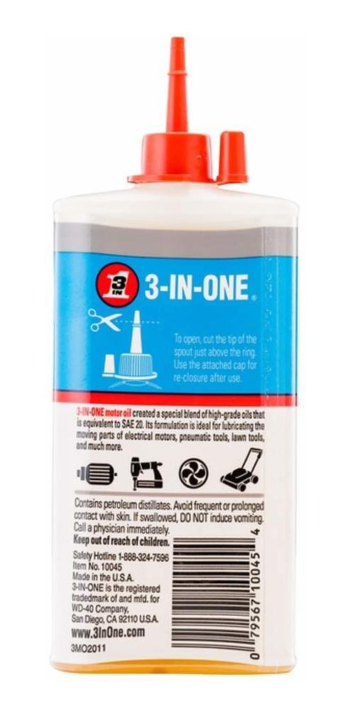 3-En-Uno de aceite de motor, 3 Oz; Lubrica The Moving Parts en pequeños motores eléctricos para extender el motor de la vida, reduciendo el desgaste y deterioro; Mezcla de aceites de alta calidad como un aceite SAE 20 calificación equivalente; Aumento de la viscosidad comparación con los aceites de motor estándar. Proporciona protección contra el desgaste extendido; Recomendado para uso con 1/4 hp o motores más grandes Todos nuestros productos estan en inglés SKU 15042015726