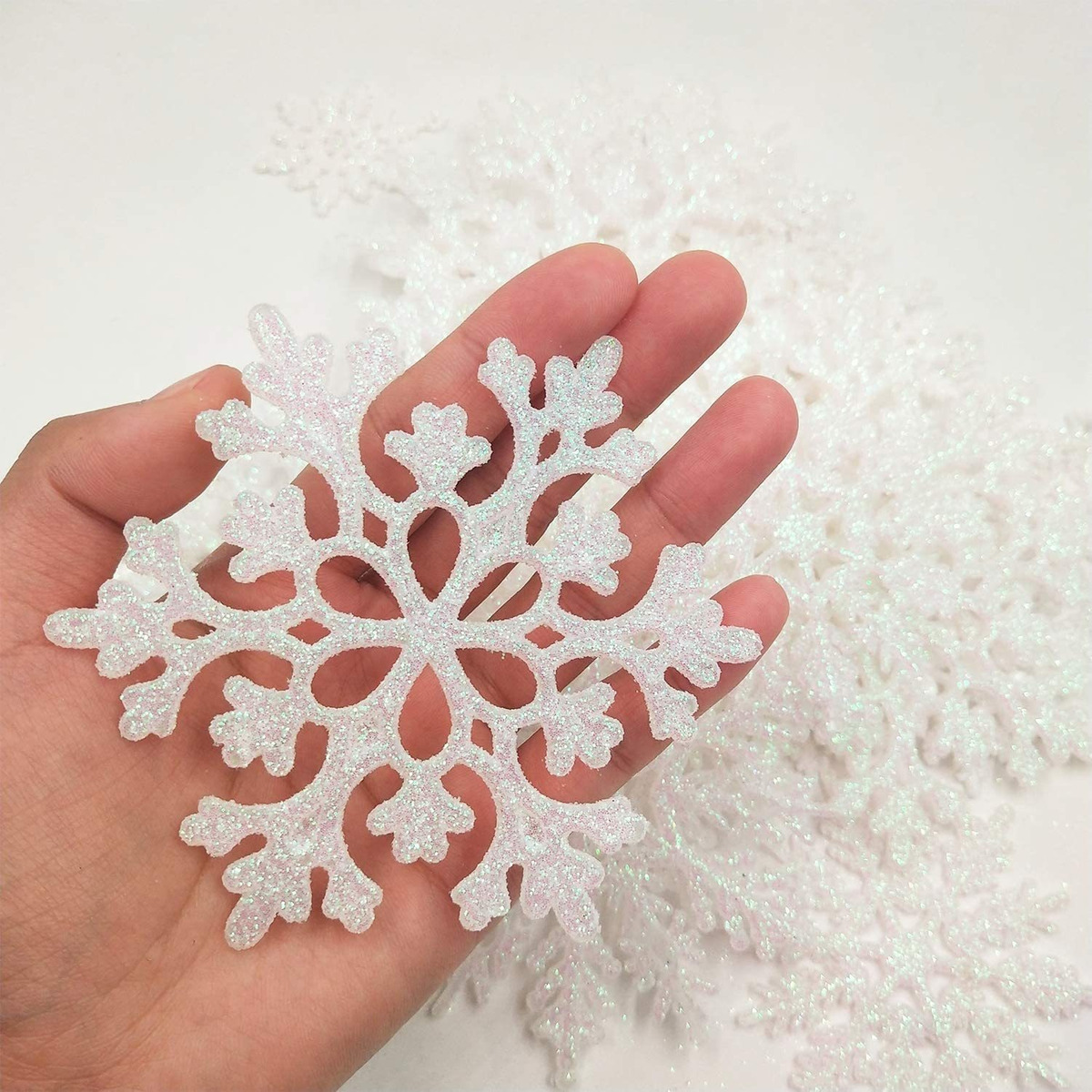 Especificaciones: 36 Adornos De Plástico Blanco Con Purpurina De Copo De Nieve