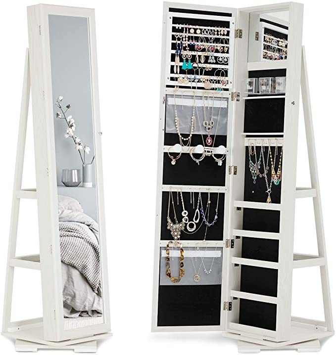 gafas de sol, bufandas, etc … De longitud completa espejo y espejo interior: El 15.7L x 65.7H gran espejo da una visión completa de su equipo de la cabeza a los pies, diseñado con dos espejos, el espejo interior es conveniente para que los usuarios elijan hermosa joyería o para compensar en la parte frontal del armario. Esta joyería armario del gabinete permiten a los usuarios ver el traje con claridad y facilidad, vidrio Premium ofrece espejo imagen real y evita divertido efecto casa .; Gran capacidad de almacenamiento con la parte posterior: Con una gran capacidad de almacenamiento, que ayuda a organizar todas sus joyas y cosméticos en un mismo espacio. Este gabinete de la joyería organizador cuenta con un amplio espacio de almacenamiento. Viene con 120 ranuras Pendiente, 78 ranuras en el anillo, de 30 ganchos de collar, 3 barras de pulsera, 5 estantes en el interior y 3 estantes adicionales parte trasera, 3 cajas de almacenamiento de acrílico, 2 bolsas de almacenamiento de PVC y 1 colgante .; Rotación de 360 grados Base: Ven con el soporte, este armario de la joyería es más fácil moverse alrededor de la casa en comparación con una inclinación uno, esto se hace a mano de la joyería de almacenamiento de la base de la rotación de 360 . Los usuarios no tienen necesidad de caminar alrededor del aparato y buscar los artículos. 360 base giratoria proporciona una gran flexibilidad para los usuarios rotar el mueble y encontrar lo esencial de forma rápida y sencilla .; Calidad y Seguridad – joyería SERWALL gabinete está hecho de cartón de fibra P2 cualificado que tienen una alta calidad. Es laca libre, totalmente bueno para el medio ambiente y la salud. Tiene una cerradura de alta calidad y llave, un armario de los niños a prueba, que puede mantener la joyería fuera del alcance de los niños .; Fácil de montar – El bastidor del gabinete de la joyería se monta previamente, sólo se necesita para montar las piernas, se preparan todas las herramientas. SERWALL está comprometida con la satisfacción del cliente 100%. si tiene algún problema, no dude en ponerse en contacto con nosotros. Todos nuestros productos estan en inglés SKU 6102015225