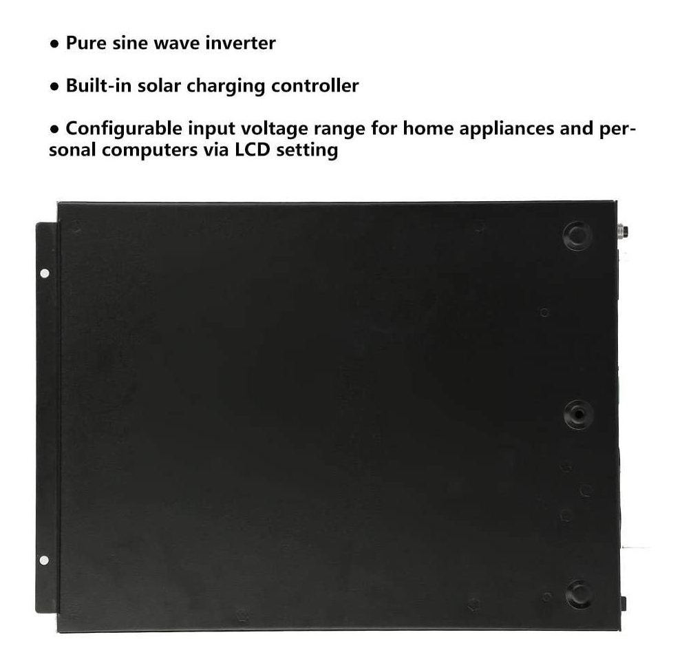 Característica: inversor de onda sinusoidal pura. Este es un inversor/cargador multifunción, que combina funciones de inversor, cargador solar y cargador de batería para ofrecer un soporte de energía ininterrumpido con tamaño portátil. Corriente de carga de batería configurable basada en aplicaciones a través de configuración LCD.; USO: prioridad configurable de cargador solar CA a través de ajuste LCD compatible con voltaje de red o alimentación del generador. Reinicio automático mientras se recupera el CA.; Función de protección: protección contra sobrecarga/sobrecalentamiento/cortocircuito. Diseño de cargador de batería inteligente para optimizar el rendimiento de la batería. Función de arranque en frío.; Ajuste LCD: rango de voltaje de entrada configurable para electrodomésticos y ordenadores personales a través de la configuración LCD. Su amplia pantalla LCD ofrece un funcionamiento de botón configurable y fácil acceso, como la corriente de carga de la batería, la prioridad del cargador AC/solar y el voltaje de entrada aceptable basado en diferentes aplicaciones.; Ámbito de aplicación: Este inversor puede alimentar todo tipo de aparatos en el hogar o la oficina, incluyendo aparatos de tipo motor como luz de tubo, ventilador, refrigerador y aire acondicionado. Este es un inversor/cargador multifunción, que combina funciones de inversor, cargador solar y cargador de batería para ofrecer soporte de energía ininterrumpida con tamaño portátil. Su pantalla LCD completa ofrece una operación de botón configurable por el usuario y fácil acceso, como corriente de carga de batería, prioridad de cargador AC/solar y voltaje de entrada aceptable basado en diferentes aplicaciones.