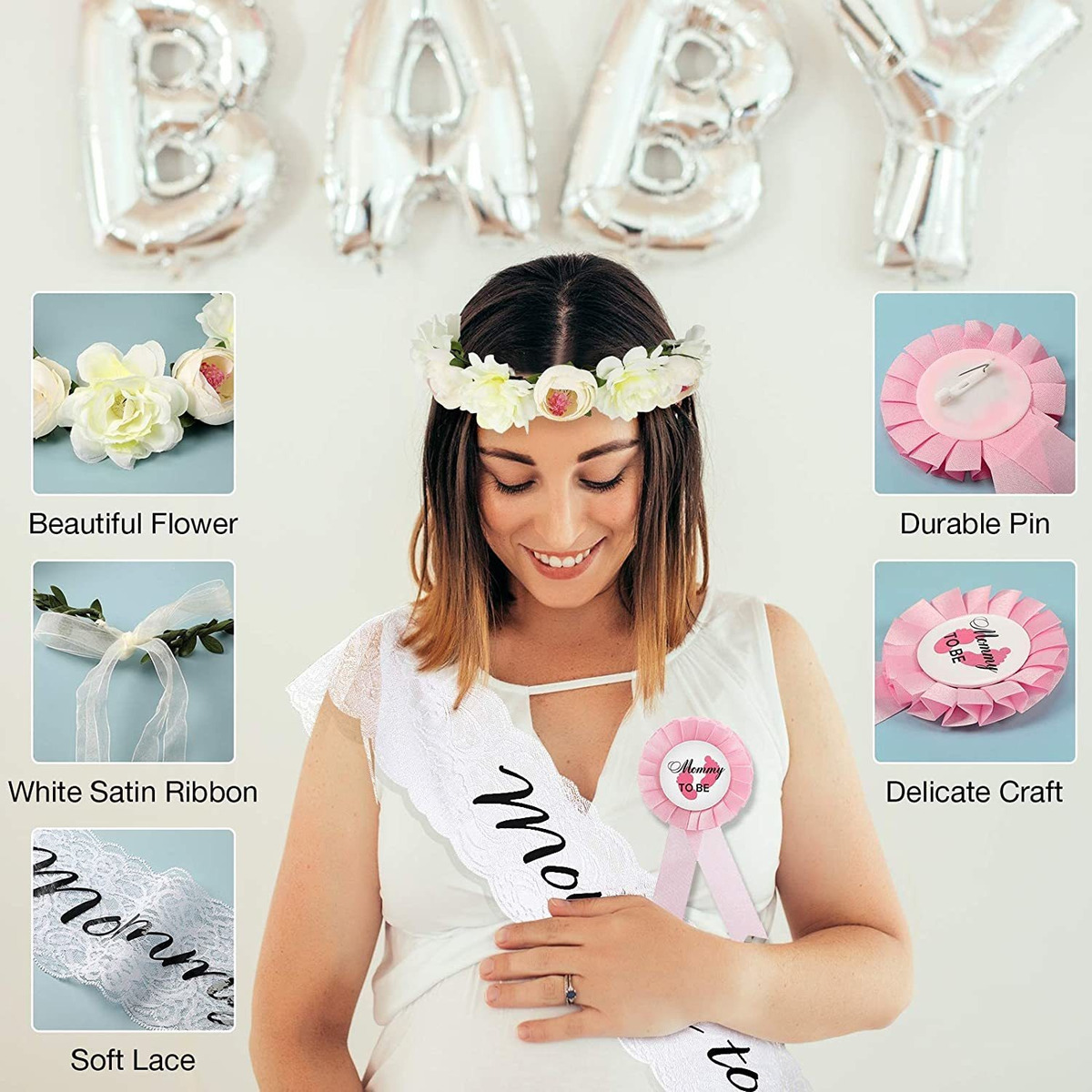 Estos faja con encaje blanco y los padres a ser insignia del perno del botón kits son adecuados para la ducha del bebé, el género revela, el bebé asperja, bebé agradable y así sucesivamente, proporcionando una sensación de orgullo de ser padres.