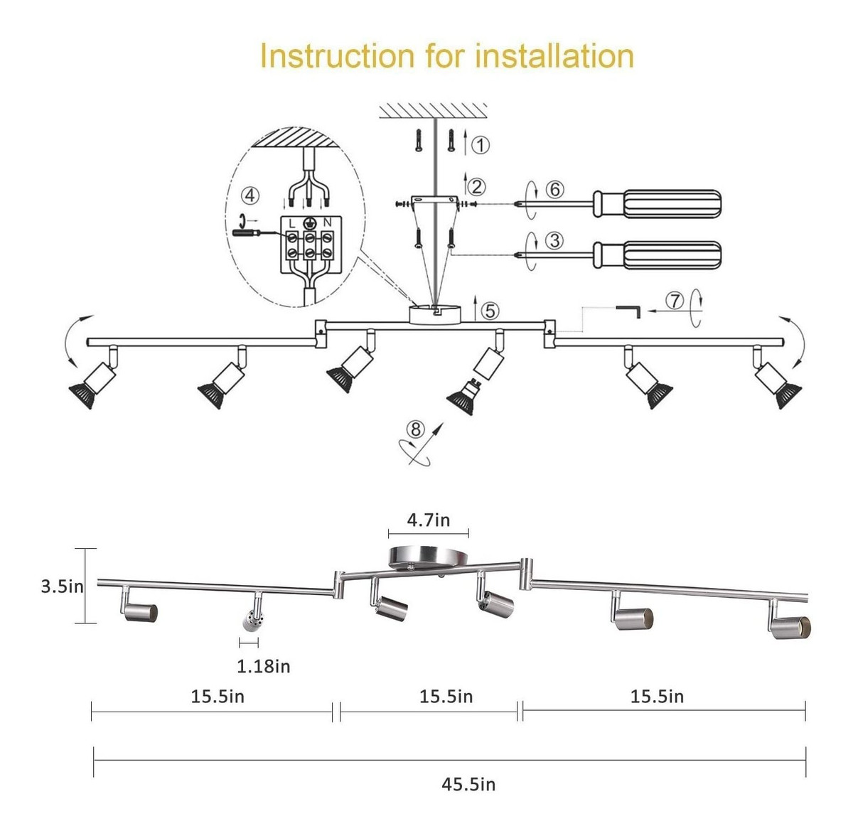 Moderno y elegante: Adoptar cuerpo níquel satinado este seguimiento se ilumina accesorio es fuerte y robusto, propios 6 cabezas de pista que ofrecen una iluminación sufciente para crear un ambiente adecuado para su cocina de su casa, pasillo, sala de estar, dormitorio .; Regulable Pista juego de luces: Muchos kits de iluminación de la pista no son compatibles con lámparas regulables, pero no se limita aquí, elegir bombillas de iluminación de pista de intensidad regulable con regulador de intensidad de pared compatible con el accesorio de regulación .; Flexible kit de iluminación de la pista: GU10 Base bombillas de iluminación de la pista no incluido, así que está bien usar su propia lámpara de bombillas tradicionales o focos LED, no importa calentar blanco o blanco frío, recuerda la potencia no superior a 50 W .; Ajustable Seguimiento Lights accesorio: incluyendo cada conjunto 6 cabezas iluminación de la pista y 3 brazos, ambos de ellos podría ser giratorio y ajustable individualmente para hacer diferentes formas y fijar las luces de la pista a la posición correcta .; Fácil de instalar: accesorio de iluminación 1 x 6 pista (no hay bombillas incluidos) 1 manual de instalación todo el hardware incluido para la instalación conveniente y de fácil seguimiento de su kit de luces para iluminar todas partes en su casa. Si necesita las cubiertas de goma para proteger sus bombillas, por favor comprar el ASIN: B086QNVCTT para que coincida con el accesorio de uso. Todos nuestros productos estan en inglés SKU 4032126580