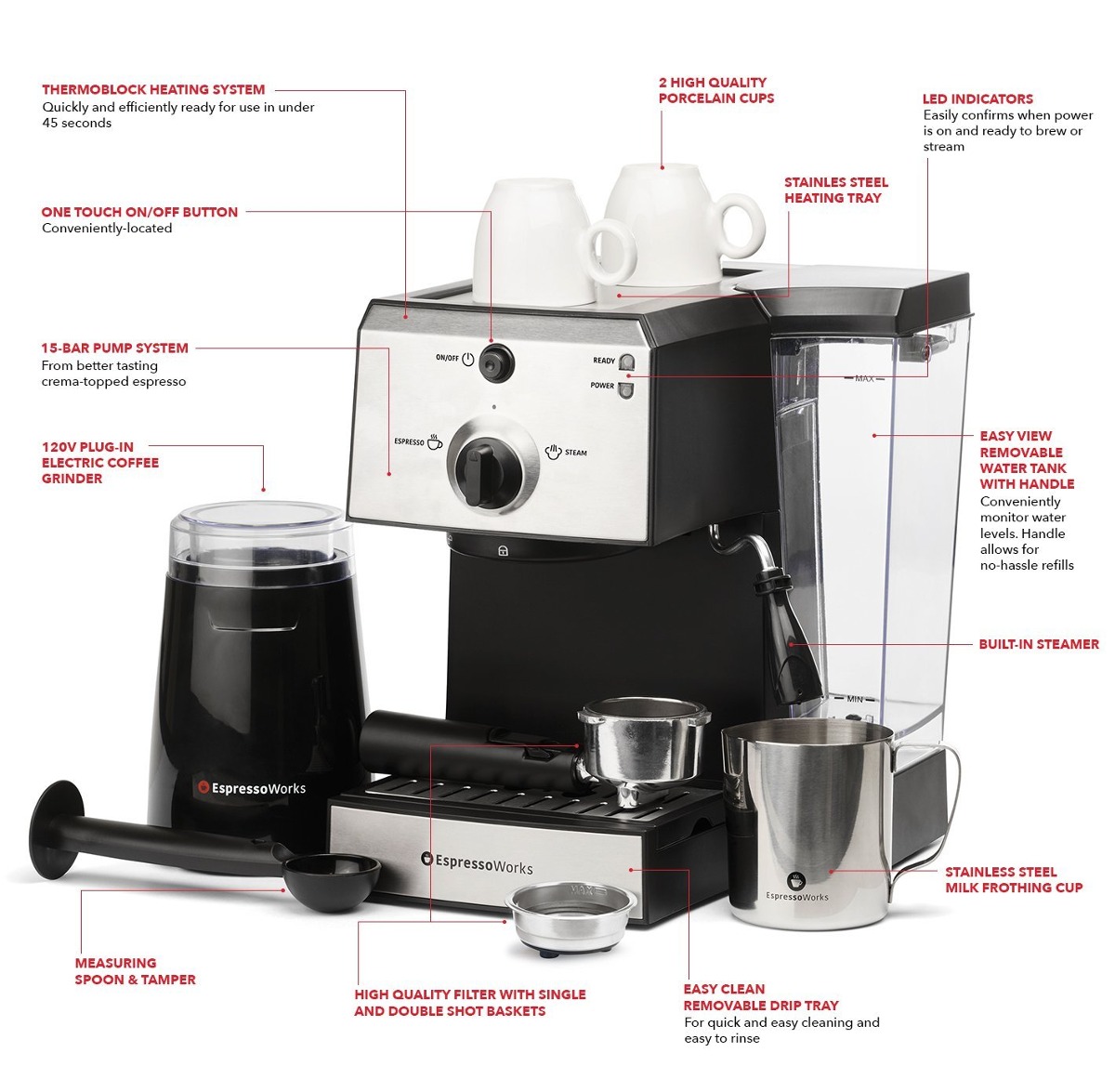 LISTO PARA SU USO EN 45 segundos- apenas añade frijoles! Con el sistema de calentamiento rápido de termobloque avanzada siempre se puede esperar preciso de la temperatura y el vapor instantáneo .; Vista fácil DESMONTABLE AGUA TANQUE Convenientemente supervisar los niveles de agua de vista tanque transparente frontal (capacidad 1,25 litros). Mango incluido en el tanque para una fácil extracción para su limpieza y rellenado .; FÁCIL limpiadores dispositivo de formación de espuma desmontable y bandeja de goteo extraíble para garantizar una limpieza sin problemas .; 15 BAR bomba de presión System- Disfruta de gran sabor espresso italiano, de Americano y macchiato. taza de espuma de leche de acero inoxidable incluye para facilitar la preparación de Lattes y cappuccinos .; SHOT simple o doble Shot-Dos cestas portafilter acero inoxidable incluidos para la opción de tirar de un solo disparo o un doble disparo durante cada elaboración de la cerveza. Todo lo que necesitamos para una preparación perfecta,!