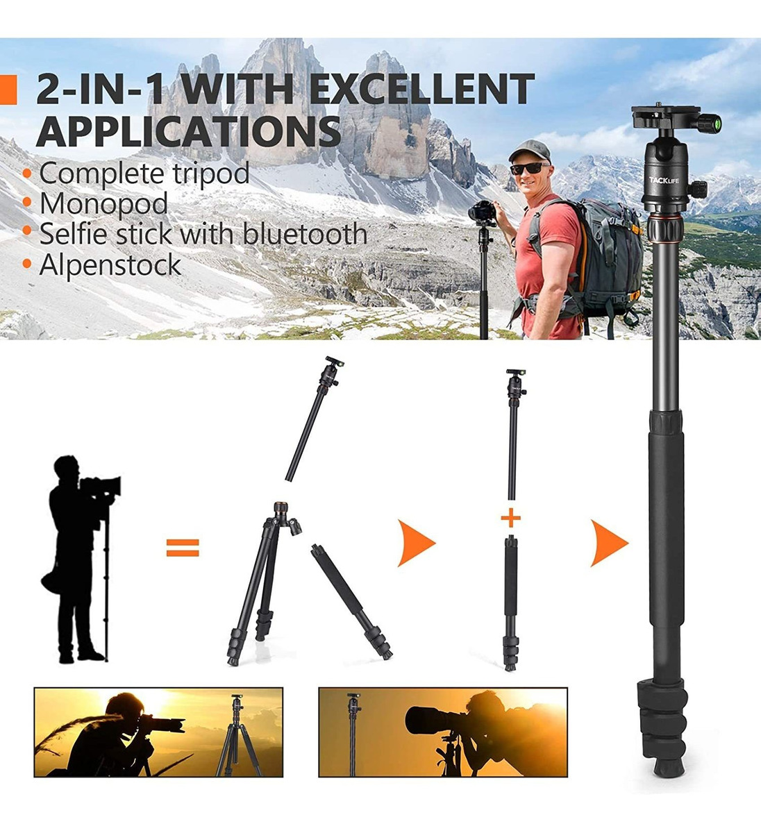 Diseño básico Óptimo Capacidad de carga: 18 libras. Mecanismo de pinza y columna Central de 2 Etapas párr AJUSTE de Altura de 17 Pulgadas a 70 Pulgadas. Bloqueo de resorte para AJUSTE de ángulo de 3 Etapas pulsando y Liberando; Monopode multifuncional: Disparo macro fino gracias al monopié desmontable. Como monopié y bastón, también equipa ONU gancho para colgar; Fácil Operación La Placa de Liberación Rápida se libera pulsando botón Aportes ONU. Se fija Mediante tornillos. Con la ayuda de los Dos Niveles de burbuja Integrados, La Placa de Liberación Rápida Se Puede Ajustar horizontal y verticalmente; Múltiples usos Gracias a la cabeza de bola de metal de giratoria duradera con escala, el Disparo panorámico de 360 ES Precisamente alcanzable. Equipado con Bluetooth, PUEDES Tomar fotos Creativas desde tu Punto de Vista en any Momento y EN CUALQUIER Lugar; Lo obtienes Que: 1 trípode TACKLIFE MLT05, 1 bolsa con cremallera, 1 mando a distancia Bluetooth, 1 Soporte para Teléfono móvil, 3 destornilladores, 1 manual de Instrucciones (idioma español no garantizado) Trípode de Carbono TACKLIFE robusto, estable y confiable Como nuevo modelo de trípode TACKLIFE, MLT05, incluyendo la Cabeza de bola this hecha de aluminio de alta Resistencia de Aleación. La pierna desmontable le permite Tomar fotos en la parte inferior del trípode y también Se Puede Como utilizar Como bastón de trekking. Todos nuestros productos estan en inglés SKU 4022165228