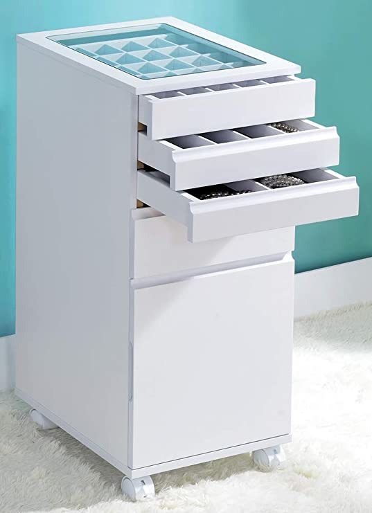 4 cajones de almacenamiento; puerta individual con 2 compartimentos; Claro de cristal superior; marco de caso de madera; llantas de ruedas Obtener un identificador de almacenamiento de accesorios con la joyería nariah armario. Esta impresionante armario cuenta con cuatro cajones y una puerta con dos compartimentos. Que le brinda un sinfín de maneras de organizar sus accesorios y mantener todo a su alcance. Ruedas hacen que este soporte fácil de transportar, y se pueden utilizar para múltiples propósitos. Disponible en acabado de color rosa y blanco Todos nuestros productos estan en inglés SKU 6102021871