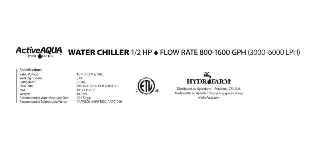 Gran capacidad de refrigeración (volumen recomendado: 90 172 galones); evaporador de titanio puro anticorrosivo para agua dulce y salada; Tasa de flujo: 1/2 HP (800 – 1600 G/h – 3000 – 6000 L/h); Nueva función de impulso que acelera el proceso de enfriamiento para un establecimiento más rápido de la temperatura inicial de la solución nutritiva; No apto para fontanería central/casa; Clasificación PSI: 10 psi máx; 1 año de garantía completa, ETL probado y clasificado; BTU nominal por hora: 4.020; Ten en cuenta que la temperatura ambiente inicial de tu solución siempre afectará a la duración del proceso de enfriamiento inicial; Tipo de fuente de alimentación: eléctrico con cable Tamaño:1/2 HP | Estilo:Active Aqua Chiller 1/2 HP