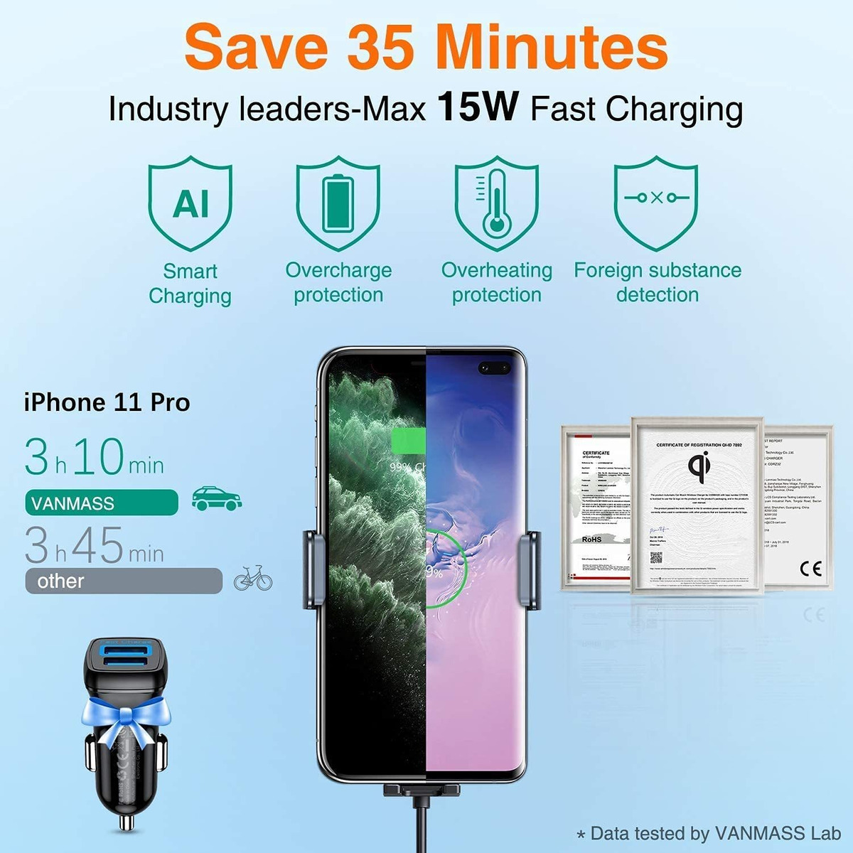 Nota de carga inalámbrica para automóvil VANMASS de 15 WCargador rápido de 7.5 W para iPhone 13/12/11 Mini, Pro, Pro Max / XS Max, XR, X/ 8, SE; cargador rápido de 10 W para Galaxy S22/S21 Ultra/S21/Note 20 Ultra/S20/S10 Edge/Note 10/S9/S9/Note 8/S8/S8/S8/S8/S8/S8/S8/S8/S8/S8/S8. ; MAX 15. Carga rápida W para LG V50/V35/V30; carga de 5 W para otros teléfonos QI. Nota: el paquete incluye adaptador de cargador de coche USB QC3.0 de doble puerto; Chips Qi de la nueva serie 2021 Carga rápida líder de 15 W – Ahorra 30 minutos: la velocidad de carga se aumenta en un 50% para ahorrar 30 minutos por carga cuando se utiliza en combinación con el cargador rápido de coche (incluido). Chips integrados de la nueva serie 2021 fabricados en Estados Unidos para proporcionar el cargador de coche Qi tiene el último estándar y múltiples protecciones como sobrecarga, sobrecorriente, cortocircuito, control de temperatura, etc; Innovación técnica 2022 Retraso de apagado: con el soporte de la batería incorporada. El cargador inalámbrico para coche también está equipado con una batería incorporada, que puede proporcionar 100 veces de apertura y cierre después de apagar la llama, sin apertura manual.; Sensor inteligente 2022 Abrazadera automática: el sensor inteligente permite una selección y lugar de 0.1 s. Simplemente coloca tu teléfono, las abrazaderas se cerrarán. Con un toque suave en el botón de liberación rápida, se abrirá automáticamente. Asegúrate de que el teléfono no se caiga ni se mueva.; Clips mejorados 2021 – Nano aceroEl clip de ventilación giratorio es adecuado para cuchillas verticales y horizontales, asegurando la estabilidad en la carretera con baches. Una base evita que el teléfono se caiga, arañe y se vuele.; Lo que obtendrás y sin preocupaciones2 clips de ventilación de aire de larga duración, 1 soporte de cargador inalámbrico WANMASS Qi de 15 W, 1 adaptador de cargador de coche USB de doble puerto, 1 cable de alimentación rápida de larga duración (4.9 ft). VANMASS se ha centrado en cargadores de coche inalámbricos durante 6 años y se compromete a proporcionar la solución inalámbrica más profesional. Por favor, no dudes en ponerte en contacto para obtener asistencia profesional si tienes alguna pregunta. Todos nuestros productos estan en inglés SKU 91221080913