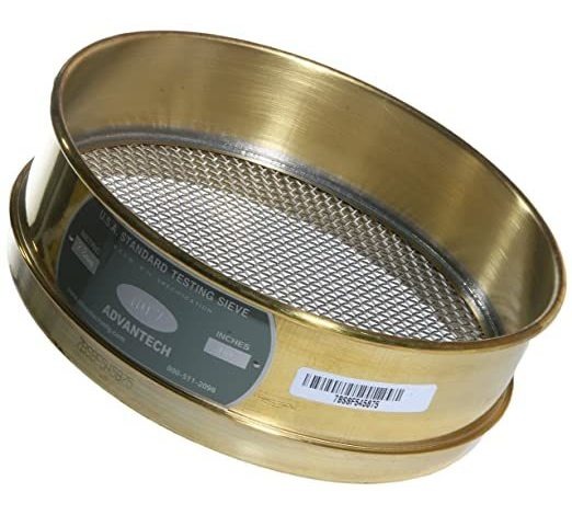 # 7 Tamaño de la malla; Alambre de acero inoxidable marco de latón, gamuza; Número de serie grabado En Cada colador y this contenida En Una Etiqueta de código de barras, el Seguimiento de información de vital importancia; Viene con certificado de Cumplimiento APLICABLE una las Especificaciones ASTM E 11 Tamaño: 8 pulgadas de diámetro, altura completa