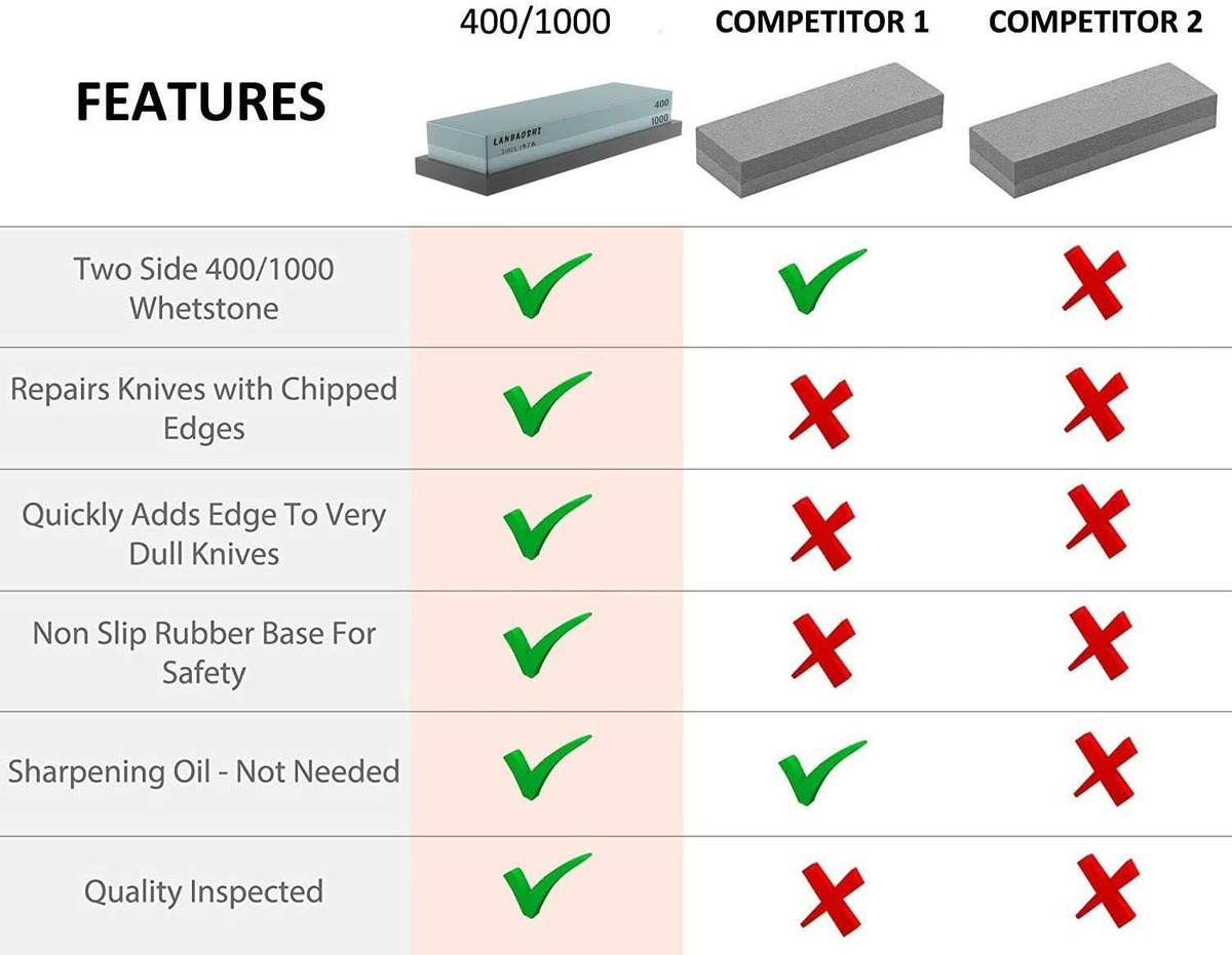 2-in-1 piedra de afilar: Waterstone está hecho de grano de carburo de silicio altamente durable dual lado 400/1000, después de 1250 grados de alta temperatura y 17 procedimientos de forja, resistente a la corrosión, resistente al calor, bordes y las esquinas están claramente demarcada . Coarse lateral (400 grit) para afilar la cuchilla, afilar cuchillos sin filo rápidamente o dañados, hacer la muesca y aplanar fallo. lado Fine (1000 grit) para el acabado y el pulido de la cuchilla, hacer los bordes más nítida .; Restaurar Nitidez: Sólo un uso de la piedra de afilar es suficiente para restaurar Nitidez de cuchillos sin filo y dammaged / maltratadas blades- para que pueda tener alta productividad, un corte más rápido que hace que la preparación de alimentos más fácil, minimiza la fatiga y reduce el estrés en la muñeca, manos y brazos causadas por cuchillos romos o apagados .; Hecho saludable comiendo más fácil: cuchillos Blunt, cuchillos oxidados son propensos a la residual de los residuos de alimentos y la proliferación de bacterias que la salud de la familia daño. La base de bambú es fácil de corroe en agua y producir una gran cantidad de bacterias. Utiliza nuestras piedra de afilar con ABS resistente a la corrosión de base antideslizante para cuchillos de cocina rápida de esmalte para resolver problemas de bacterias en la fuente y la salud familiar de protección .; uso multipropósito: Nuestra piedra de afilar afilar kit adecuado para cualquier elemento que desee afilado y pulido, incluyendo cubiertos de cocina, tijeras, cuchillos de caza o de bolsillo, cuchillas y navajas de afeitar. También funciona para hachas, hachas, talla y herramientas de jardinería. Utilizando nuestra piedra de afilar puede extender la vida de la cuchilla y ahorrar el dolor constante de la compra de un nuevo cuchillo .; Garantía de por vida: Tiempo de vida sin preocupaciones de garantía de producto que garantiza el disfrute de larga duración de su cuchillo conjunto piedra de afilar. le prometemos todas las cualidades piedra de afilar piedra de afilar y servicio al cliente. es adecuado para cualquier gente de edad como regalo sorpresa. LANBAOSHI 400/1000 Dual Grit Piedra de afilar