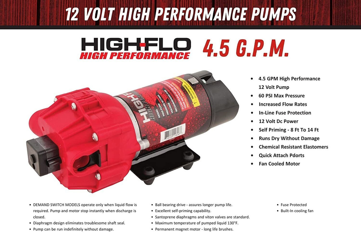 La bomba de demanda de 4.5 GPM con características mejoradas puede bombear hasta 60 PSI y cuenta con fusible de 15 amperios, válvulas Viton, diafragma Santoprene y un motor refrigerado internamente por ventilador que ofrece un rendimiento constante bajo carga pesada; Los elastómeros químicamente resistentes proporcionan una mayor tasa de flujo ofreciendo un rendimiento superior. Aprobado para su uso con Roundup; Mayor vida útil del motor, flujo de cámara optimizado, válvulas de retención integradas mejoradas que ayudan a mantener la presión y evitar el reflujo; No daña la bomba ni limita la fiabilidad; La bomba de alimentación de 12 V CC se adapta a los pulverizadores más populares. Sustituye a los números de pieza de la bomba 5281372, 5275088, 5277982, 5275704, 5275498, 5274983 y 5275017 La bomba de demanda de alto rendimiento 4.5 GPM de 12 voltios de alto rendimiento establece el estándar para bombas eléctricas. Con una presión máxima de 60 PSI, esta bomba autocebante ofrece mayores caudales y una mayor vida útil de la bomba. Un interruptor de demanda integrado se apaga automáticamente a la presión máxima. Con protección de fusibles en línea, elastómeros resistentes a químicos, accesorios de puerto de conexión rápida, motor refrigerado por ventilador y accionamiento de rodamientos de bolas hace que esta bomba de la serie Performance sea lo suficientemente duradera como para funcionar en seco sin daños. Combinado con la mejor garantía de 2 años, la bomba High Flo está construida para años de servicio sin problemas. Todos nuestros productos estan en inglés SKU 15092138966