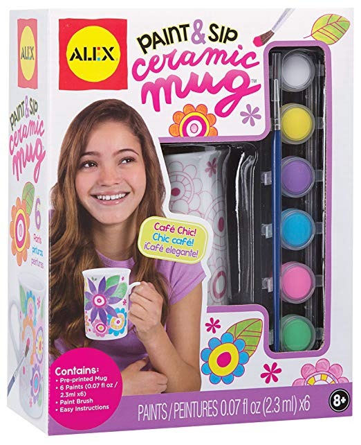 Decorar su propia taza de cerámica; Preimpreso para facilitar la pintura; Cocer la taza para fijar la pintura; Incluye una taza de cerámica con las ilustraciones pre-pretend, 6 pinturas cerámicas, pincel y instrucciones fáciles; Recomendadas para niños de 8 años de edad y mayores ALEX Toys Craft Paint y Sip taza de cerámica le permite decorar su propia taza de cerámica. Este conjunto incluye obras de arte pre-impresa para facilitar su pintura. Perfecto para hacer como un regalo o para usar en casa! Para obtener los mejores resultados, hornee a establecer pintura. Recomendado para niños de 8 años de edad y mayores. supervisión de un adulto requiere si la cocción. Todos nuestros productos son de Estados Unidos SKU 8111844985