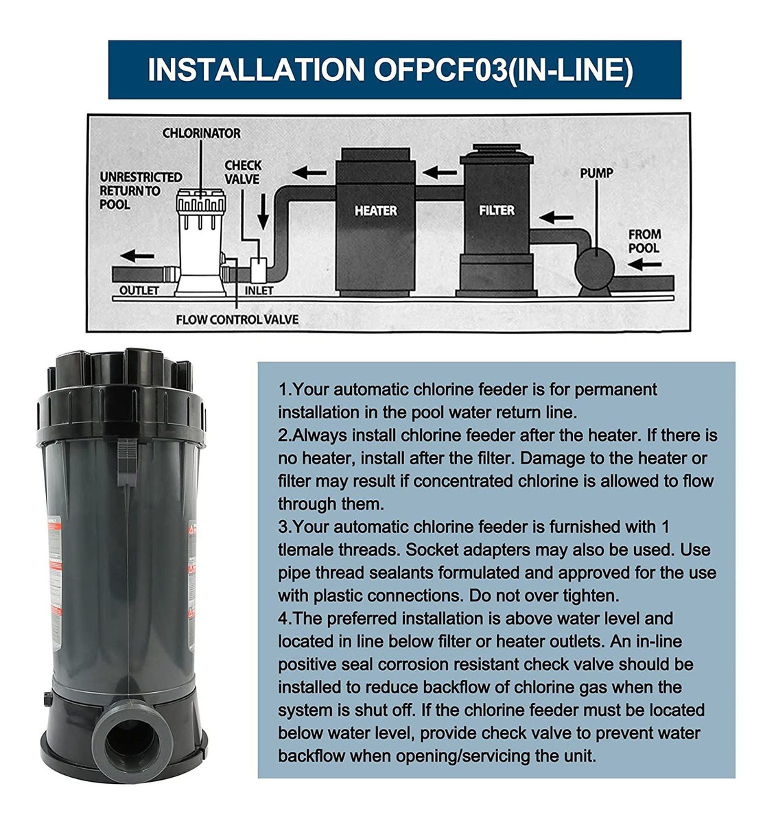 Excelente efecto: la máquina de cloro automática CL200 ON-Line puede inyectar automáticamente las tabletas de cloro inyectadas, varillas o tabletas de bromo en el agua que fluye, y luego entrar en la piscina sobre el suelo para lograr el efecto de purificación. Solo tienes que colocar tus pastillas de cloro, varillas o pastillas de bromo en la posición designada para lograr fácilmente un buen efecto de purificación. El alimentador de cloro en línea puede procesar hasta 40.000 galones de agua.; Fácil de usar: el clorador automático en línea CL200 tiene una tuerca giratoria de bloqueo fácil en la parte superior. Solo tienes que pulsar el dedo para liberar el botón para abrirlo, y luego colocar fácilmente las pastillas de cloro para lograr el propósito de purificación. La posición de la entrada y salida de agua de 2.0 in está equipada con una válvula de control de dial y el nivel de liberación de presión puede ser controlado por una perilla de 360, para ajustar la velocidad de alimentación de forma más cómoda y rápida.; Materiales de calidad: el producto adopta un excelente material ABS de alta calidad, el cilindro es más duradero y tiene una vida útil más larga. El sello de goma de flúor de alta calidad en la interfaz puede mejorar en gran medida la resistencia a la corrosión al tiempo que mejora el rendimiento de sellado, por lo que es más seguro y duradero de usar.; Fácil de instalar: el diseño superior hace que la instalación sea muy simple y no requiere herramientas complicadas. Se puede instalar fácilmente en equipos nuevos o equipos existentes solo mediante el uso de tubos de PVC. Es adecuado para cualquier piscina y spa existente. Hay detalles en el paquete de software. Las instrucciones pueden ayudarte a resolver todos los problemas de instalación.; Buen servicio posventa: los productos son almacenados y distribuidos oficialmente por Amazon, lo que es muy conveniente y rápido. Tenemos un equipo profesional y buen servicio posventa. Si tienes alguna pregunta después de recibirla, puedes ponerte en contacto con nosotros directamente, y te daremos una respuesta satisfactoria dentro de las 12 horas. Efecto excepcional: La máquina de cloración automática CL200 ON-Line puede inyectar automáticamente las tabletas de cloro inyectadas, barras o tabletas de bromo en el agua que fluye, y luego entrar en la piscina arriba del suelo para lograr el efecto de purificación. Solo necesita colocar sus tabletas de cloro, barras o tabletas de bromo en la posición designada para lograr fácilmente un buen efecto de purificación. El alimentador de cloro en línea puede procesar hasta 40.000 galones de agua. Fácil de usar: el clorador automático CL200 On-line tiene una tuerca giratoria Easy-Lock en la parte superior. Solo necesita presionar el dedo para soltar el botón para abrirlo, y luego colocar fácilmente las tabletas de cloro para lograr el propósito de purificación. La posición de la entrada y salida de agua de 2 pulgadas está equipada con una válvula de control de dial, y el nivel de liberación de presión puede ser controlado por una perilla de 360, para ajustar la velocidad de alimentación más conveniente y rápidamente. Materiales de calidad: el producto adopta un excelente material ABS de alta calidad, el cilindro es más duradero y tiene una vida útil más larga. El sello de goma de flúor de alta calidad en la interfaz puede mejorar en gran medida la resistencia a la corrosión mientras mejora el rendimiento de sellado, haciéndolo más seguro y más duradero de usar. Fácil de instalar: el diseño superior hace que la instalación sea muy simple y no requiere herramientas complicadas. Se puede instalar fácilmente en equipos nuevos o equipos existentes solo mediante el uso de tuberías de PVC. Es adecuado para cualquier piscina y spas existentes. Hay detalles en el paquete de software. Las instrucciones pueden ayudarle a resolver todos los problemas de instalación. Buen servicio post-venta: Los productos son oficialmente almacenados y distribuidos por Amazon, que es muy conveniente y rápido. Tenemos un profesional y buen equipo de servicio post-venta. Si tiene alguna pregunta después de recibirla, puede ponerse en contacto con nosotros directamente, y le daremos una respuesta satisfactoria dentro de las 12 horas. Todos nuestros productos estan en inglés SKU 15092107878