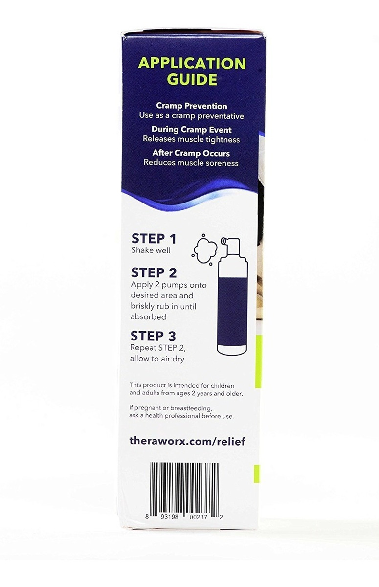 Alivio Theraworx es una solución tópica segura y eficaz que puede ser utilizado diariamente para prevenir calambres y espasmos musculares. También se puede usar para el alivio de acción rápida cuando se produce un calambre, la liberación de la tensión muscular y la reducción del dolor después.