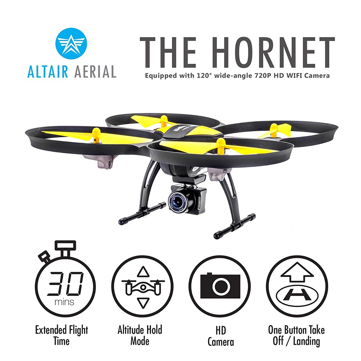 Cámara 720p HD para fotos aéreas increíbles y videos; Fácil de volar para todas las edades. Ajustes de habilidad múltiples incluidos; Los modos de vuelo como Altitud Hole, un botón de despegue y aterrizaje, y el modo sin cabeza; Listo teléfono inteligente pero no es obligatorio; Duradera construido para vuelos estables El Altair AA818 avispón Plus aviones no tripulados es el zumbido perfecto todo-en los niveles de habilidades para todo, desde la fotografía para vuelos recreativos. Ofrecemos todas las características de un avión no tripulado de gama alta a los 3 niveles de habilidad diferentes, por lo que si eres un primer temporizador o un maestro de vuelo, tenemos algo para usted.