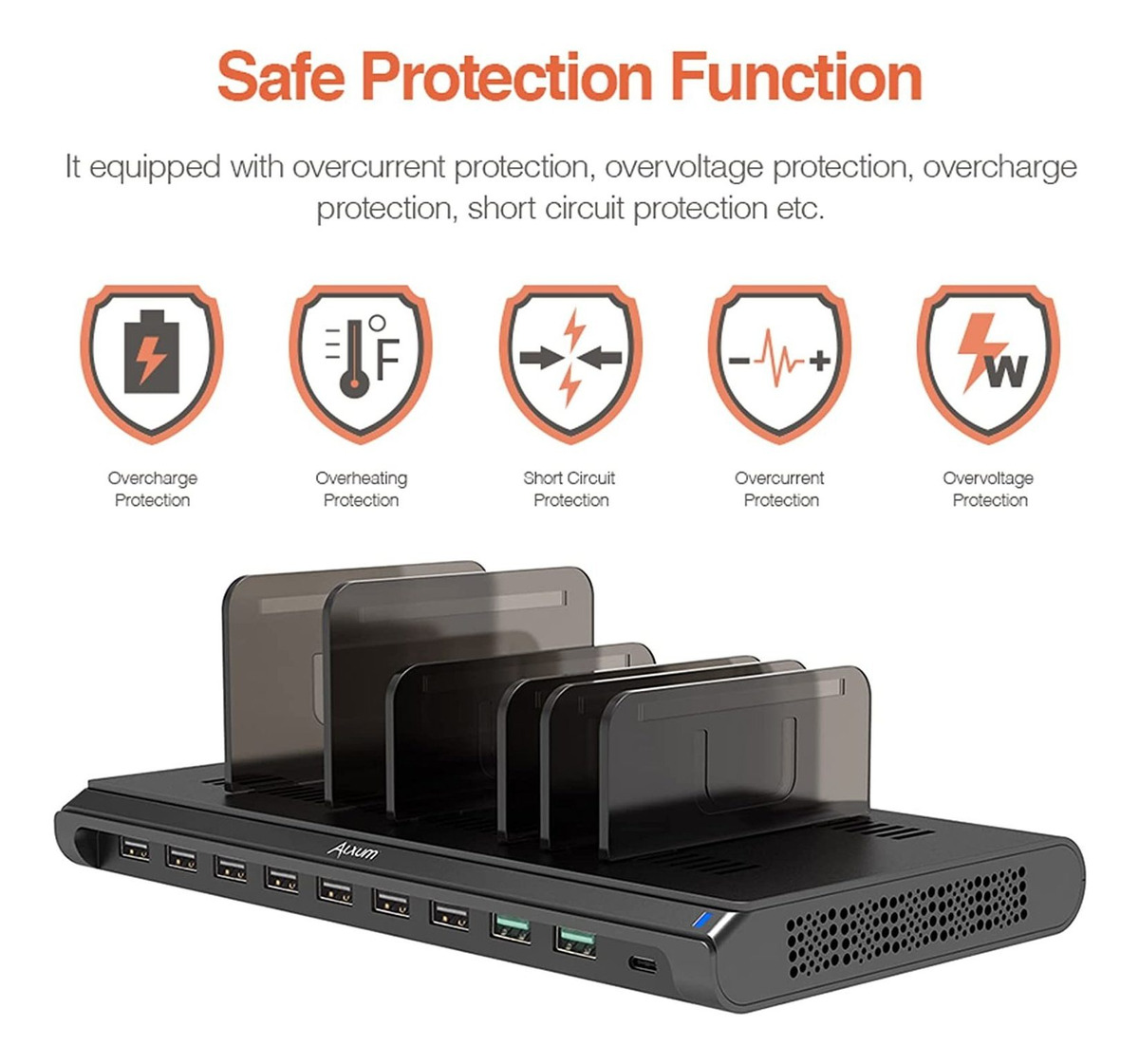 Carga rápida USB 3.0 y base USB tipo C 2 puertos de carga QC 3.0 compatibles con iPhone, Samsung Galaxy S8, Note, etc. 1 puerto de carga USB tipo C, compatible con Samsung Galaxy Note 8 S8, LG V30 G6 V20, One Plus 5, etc. (Cable de carga no incluido); Estación de carga para múltiples dispositivos: carga hasta 10 dispositivos alimentados por USB simultáneamente, especialmente compatible con 8 iPads a la vez. Carga rápida con tecnología BC 1.2, proporciona hasta 5 V 2.4 A de potencia por puerto. Mantén tu iPad, iPhone, smartphones y otros dispositivos en un solo lugar y mantén tu dispositivo organizado.; Separador ajustable: ajusta el ancho fácilmente a cualquier tamaño que necesites, sujeta tu iPad o iPhone incluso si están en las fundas y evita que tus dispositivos se rayen. Además, separadores de alta calidad (5 piezas de alto, 6 piezas cortas) de diferentes alturas: divisores más altos para dispositivos más grandes como iPad y tabletas, separadores cortos para iPhone y Kindle.; Seguridad certificada: protección de nuevo sobre carga, sobrecalentamiento, sobretensión y cortocircuito. La protección contra sobretensiones mantiene tus aparatos seguros. Estado de la pantalla LED; con función de detección automática y ajuste de salida de potencia en función de los dispositivos, protege aún más la vida útil de los dispositivos.; Lo que obtienes: Alxum profesional lleno de servicios al cliente para eliminar tus preocupaciones. Todos nuestros productos estan en inglés SKU 91221077044