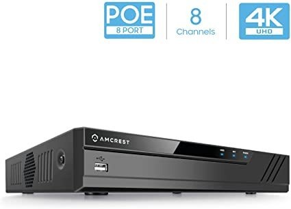 de Amcrest NV4108E-HS 8CH POE NVR soporta discos duros de hasta 6 terabytes, mientras que con 8 canales de grabación, reproducción y Vista en vivo de hasta 8 megapíxeles Resolución / 4K en tiempo real @ 30fps .; avanzada tecnología de compresión H.265 permite ahorrar espacio de almacenamiento que permite tiempos de grabación más largos. La tecnología H.265 comprime el vídeo sin sacrificar nada de la calidad de vídeo Ultra HD. búsqueda inteligente, la reproducción, y las funciones de copia de seguridad proporcionan una mayor facilidad de uso y seguridad (por ejemplo, un evento de detección de movimiento y exacta funciones que son una precisión de una segunda búsqueda) .; Plug & configuración Play, fácil de configurar, el acceso y el control. Código QR de exploración en la POE NVR de «Amcrest Ver» aplicación para la visualización en directo al instante acceso y reproducción. Se conecta y gestiona todas las cámaras POE IP en su red directamente a través de sus cables de Ethernet para la máxima facilidad y comodidad en un sistema de seguridad .; Blazing rendimiento de 80Mbps le permite ver las cosas suceden como suceden: en tiempo real, vídeo de alta definición altamente fiable sin pérdida o retraso. Convenientemente empaquetado con extras como ratón USB, cable de red, y la guía de inicio rápido .; Incluye función de copia de seguridad USB para su tranquilidad. Todos los sistemas CE y FCC certificados con UL alimentación compatibles con suministros. Garantizada por un año completo desde la compra con la ayuda de Estados Unidos y la garantía de Estados Unidos ofrecida exclusivamente por Amcrest. Todos nuestros productos estan en inglés SKU 21052001275
