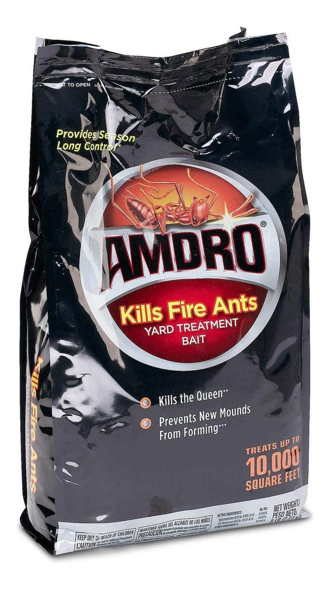 One application kills fire ants for the entire season; Kills the queen and the entire colony; Kills visible and hidden fire ant mounds; Prevents new mounds from forming; Apply across entire yard with a rotary broadcast spreader or handheld granular spreader; One 5 pound bag covers up to 10,000 square feet; Also kills bigheaded ants and harvester ants AMDRO Fire Ant Yard Treatment is a season-long fire ant killer. It kills visible and hidden fire ant mounds and prevents new mounds from forming for the entire season. Once spread, the worker fire ants carry it back to the colony to share it with the queen. After the queen eats it and dies, her colony dies with her.