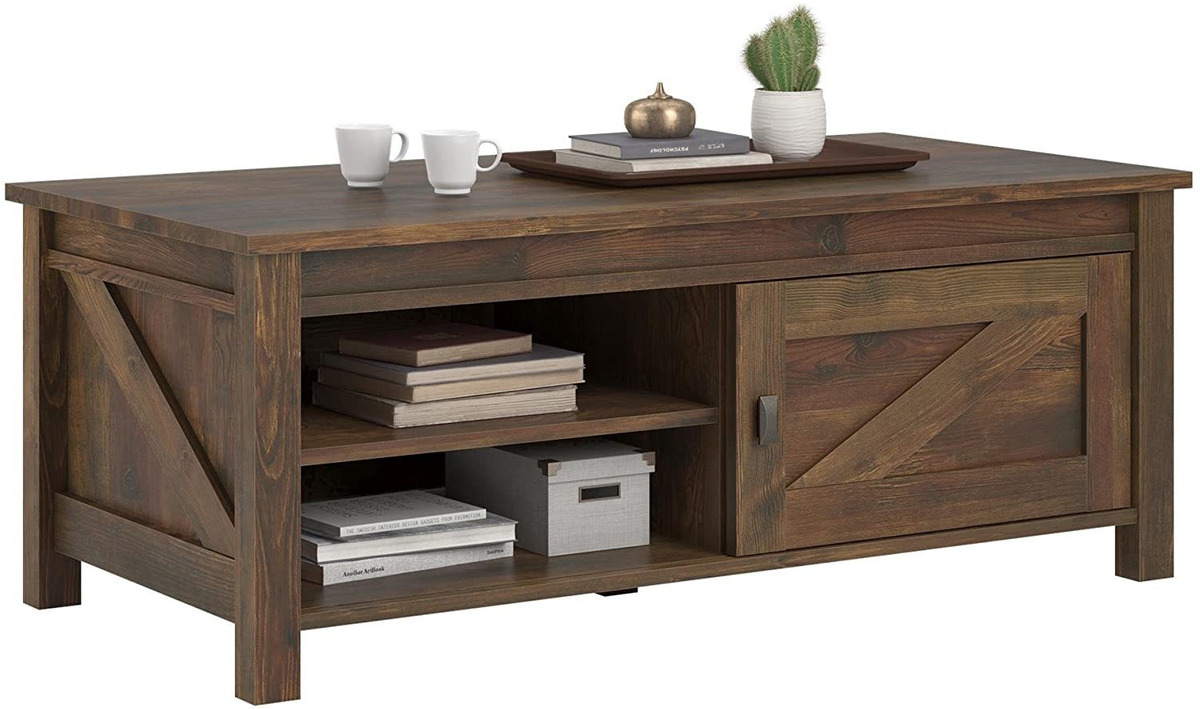 Añadir un toque rústico a su habitación o familiares salón con la mesa de centro Ameriwood Inicio Farmington; Dos estantes más bajos, 1 ajustables, puertas correderas hacen detrás de la organización de los libros y revistas simple y la superficie superior grande es genial para mantener los mandos a distancia, aperitivos o una decoración de temporada en; El acabado de color marrón medio degradado tiene una textura de madera para emular granero de madera envejecida y par perfectamente con los tirones de bronce frotados aceite en las puertas correderas. La superficie superior sostendrá 100 libras; Construido de alta resistencia laminado MDF y de partículas para un robusto, de construcción duradera; Se recomiendan dos adultos para el montaje correcto. Dimensiones: 18.375” h x 47.625” w x 23.625” d Todos nuestros productos estan en inglés SKU 15042029318