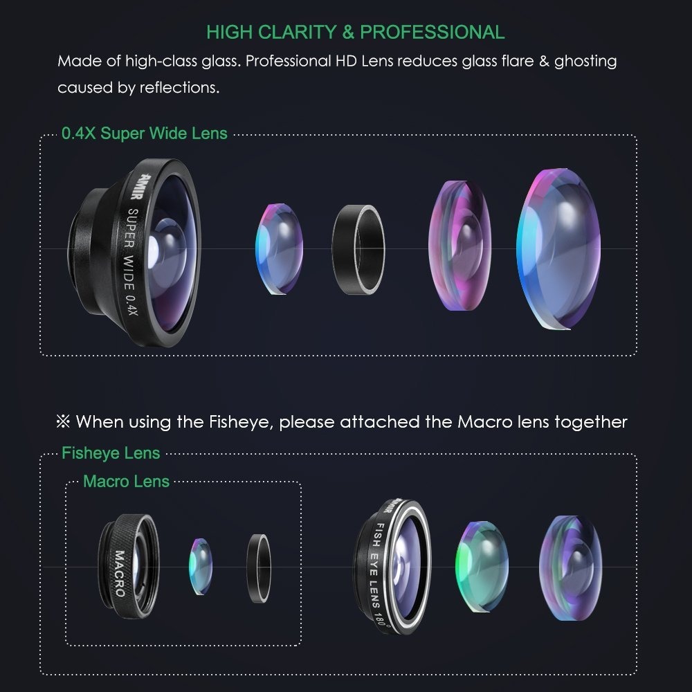 Especificaciones: Amir Lente De La Cámara Kit, 0,4x Lente Gran Angular + 180 °