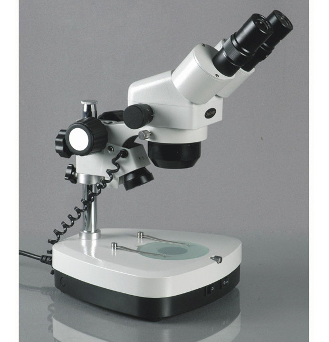 microscopio estéreo profesional con soporte pilar tiene larga distancia de trabajo para que los usuarios puedan realizar un trabajo o manipular objetos grandes, incluyendo gemas, joyas, y la electrónica; cabeza de visión binocular con pares de 5x, 10x y 20x oculares de campo amplio, la distancia interpupilar ajustable, fijo inclinación vertical de 45 grados para reducir los ojos y la tensión del cuello, y la capacidad de rotación de 360 ¿¿grados para permitir el intercambio; 1x-4x objetivo zoom proporciona aumento de zoom continuo y la longitud focal más larga para la inspección de muestras a gran escala, y una lente Barlow 0.5x se extiende la distancia de trabajo; Reostatos controlados por el superior y la iluminación inferior tiene 10W fuente de luz halógena para iluminar especímenes, placa de la platina esmerilado permite que la luz pase a través de debajo con muestras transparentes, y reversible placa de la platina blanco y negro proporciona contraste con las muestras a la luz y de color oscuro; mesa de pilar-estilo de pie con los clips de enfoque y de la etapa gruesas bilaterales para asegurar el espécimen durante la visualización El profesional microscopio estéreo con zoom AmScope SH-2BZ-C2 tiene pares intercambiables de 5x, 10x y 20x de campo amplio, un objetivo zoom 1x-4x, y un soporte de pilar. El microscopio tiene un rango general de aumento de 5x-80x. La cabeza de visión binocular tiene un rango de interpupilar de 55 a 75 mm, una inclinación de 45 grados para reducir los ojos y la tensión del cuello, y la rotación de 360 ¿¿grados para permitir el intercambio. El WF5x18mm, WF10x18mm y WF20x10mm campo amplio oculares se combinan con el objetivo de zoom 1x-4x para proporcionar aumento de zoom continuo y una mayor distancia de trabajo para la inspección de muestras a gran escala que requieren un manejo o reparación. ajuste dióptrico acomoda diferencias ojo resistencia individuales. El microscopio incluye una lente Barlow 0.5x que se puede añadir con el objetivo de disminuir el rango de ampliación. Una lente de Barlow con una ampliación de menos de 1,0 reduce la ampliación y aumenta la distancia de trabajo. Un microscopio estereoscópico, a veces llamado una inspección o microscopio de disección, tiene bajo aumento y una distancia de trabajo que permite a los usuarios manipular el objeto que se inspecciona.