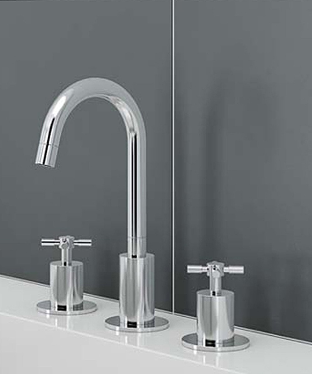 surtidor de arco moderno y dos asas en forma de cruz separados en un estilo contemporáneo con la construcción de latón macizo en acabado cromo; cartucho de la válvula de disco de cerámica diseñado para la instalación estándar de 3 agujeros; entradas de cobre con adaptadores de 9/16 pulgadas macho, los conectores y la tuerca; Viene con un código de color de la manguera de acero inoxidable trenzado flexible para facilitar la conexión; Certificación: cUPC aparece Estilo: 3 orificios de instalación