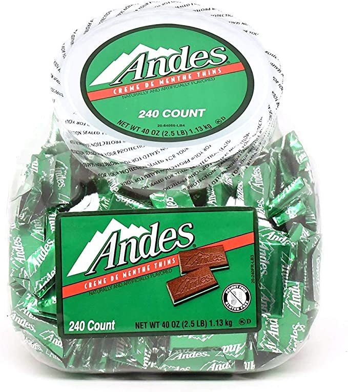 Rectangular caramelo de tres capas, verde menta intercalada entre dos capas a base de cacao delgadas; 1 Tina de 240 Andes crema de menta mentas finas; Individualmente envueltas en papel aluminio, trozos pequeños; Perfecto para una merienda todos los días o una gran manera de terminar una comida maravillosa; Andes mentas son kosher, maní gratuito y sin gluten. Todos nuestros productos estan en inglés SKU 21052031352