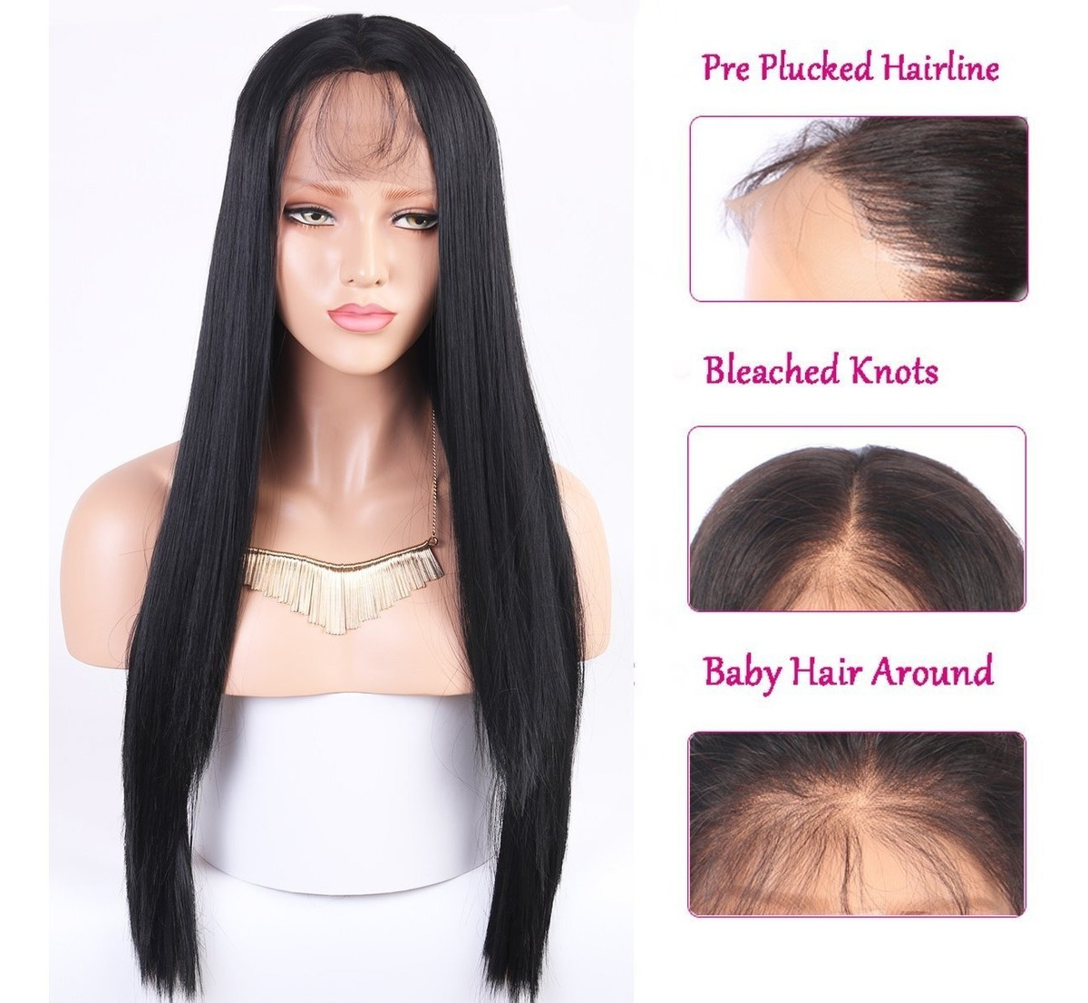 Peluca delantera del cordón de largo recto natural del pelo Negro peluca de pelo con las pelucas de pelo del bebé Bleache Nudos medias manos de marea