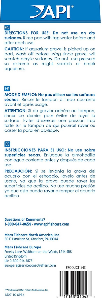 API ALGAS rascador para ACRÍLICO ACUARIOS utiliza un extra-larga, extra-fuerte mango con estropajo duradera para facilitar la limpieza de los acuarios de acrílico. Elimina las algas antiestéticas de forma rápida y eficaz, con extra-mango largo para evitar que las manos se mojen. No utilice una presión extrema sobre el producto. Con los productos de la API de acuario, es fácil de mantener una hermosa agua salada, agua dulce o acuarios de arrecife. Durante más de 50 años, la API ha sido la creación de soluciones innovadoras, impulsadas por la investigación que hacen que sea más fácil de cuidar a los peces y el acuario. Suministros API de tratamiento acuario están diseñados para trabajar en conjunto con los demás para proporcionar los mejores resultados para controlar las algas, promover el crecimiento de bacterias saludables y ayudar a controlar y curar enfermedades de los peces y las condiciones tales como la pudrición de ICH y la aleta. Trabajan para proporcionar un ambiente seguro y acogedor para los peces como el pez tropical comunidad, cíclidos, peces de colores y más. Con la API, que puede pasar más tiempo admirando a los peces, y menos tiempo de lavado de su tanque. Asegúrese de utilizar todos los productos según las instrucciones con el fin de garantizar los mejores resultados. Contiene una (1) de la API ALGAS rascador para acuarios de acrílico 1-Conde de contenedores; Elimina rápidamente algas antiestéticas de acuarios de acrílico .; mango extralargo mantiene su mano se moje .; Para su uso en acuarios de acrílico sólo .; Se utiliza para limpiar y eliminar los acuarios de acrílico de algas. Adicional Filtrado Todos nuestros productos estan en inglés SKU 22091721981
