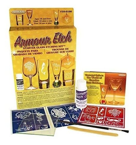 1-1 / 2-oz etch armadura; Hace un gran regalo para un especial del hágalo usted mismo en su lista Una versión condensada de nuestro popular grabado de vidrio Kit Deluxe … hemos incluido una variedad de plantillas 34 RubnEtch pre-grabado, corte de 1-1 / 2 onzas Armour Etch crema, cepillo de pelo de camello, aplicador en barra, un grupo 3- 1/2 x 3-1 / 2-pieza de la práctica de vidrio para su primer proyecto, y hoja de instrucciones ilustrada. Este kit es la perfecta introducción al arte del grabado de vidrio creativo. Hace un gran regalo para un especial del hágalo usted mismo en su lista. Todos nuestros productos estan en inglés SKU 4032124474