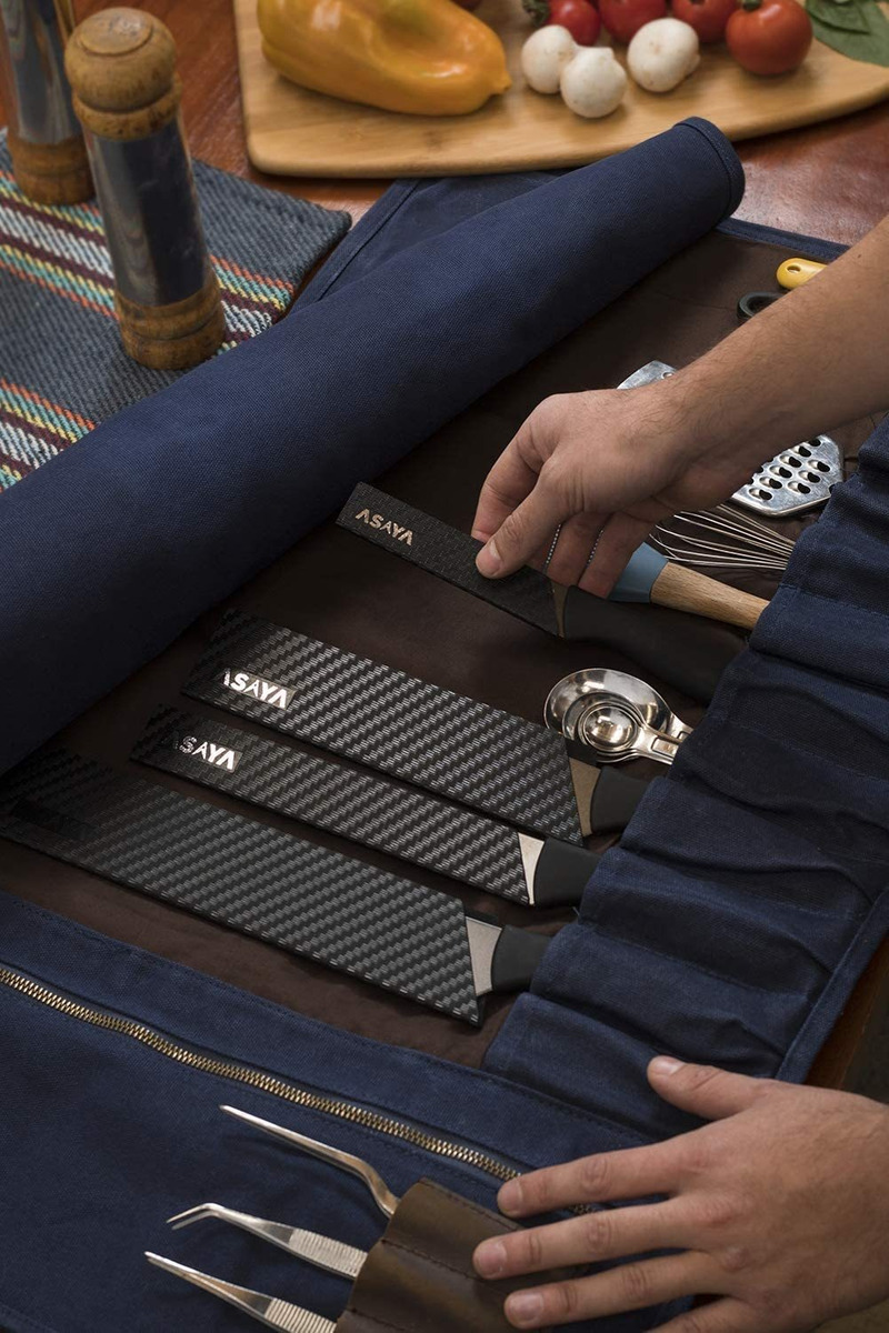 Artesanía experta: los rollos para cuchillos de lona encerada Asaya están meticulosamente diseñados para crear la funda de transporte perfecta. Hecho a mano con lona encerada resistente al agua, cuero de grano superior y hebillas de latón, están construidos para durar muchos años de desgaste en la cocina. Queremos que nuestros chefs se instalen con el mejor equipo posible que los dure toda una vida.; Espacioso y espacioso: con 15 ranuras para cuchillos, soporte para tarjetas de visita y un gran compartimento con cremallera, este rollo de cuchillos profesional puede transportar fácilmente todo un juego de cuchillos de chef y utensilios de cocina.; Ligera y portátil: solo pesa 2.9 lbs. pero puede soportar fácilmente más de 30 libras. Vale la pena cocinar. Con un mango de cuero reforzado y correa de hombro ajustable, esta bolsa para cuchillos está cuidadosamente diseñada para ser cómoda y fácil de llevar.; Medidas: 8.0 in de ancho cuando está enrollado y 29.5 in de ancho cuando está totalmente abierto. Mide 17.5 pulgadas de alto y puede sostener cómodamente cuchillos de hasta 16.5 pulgadas de largo incluyendo la espiga.; ExecuChef es ahora productos de Asaya Chef. – Misma gran calidad, nuevo nombre brillante. Si tienes cualquier problema con los productos, por favor ponte en contacto con nosotros directamente. Vamos a resolver el problema inmediatamente Todos nuestros productos estan en inglés SKU 91221042134