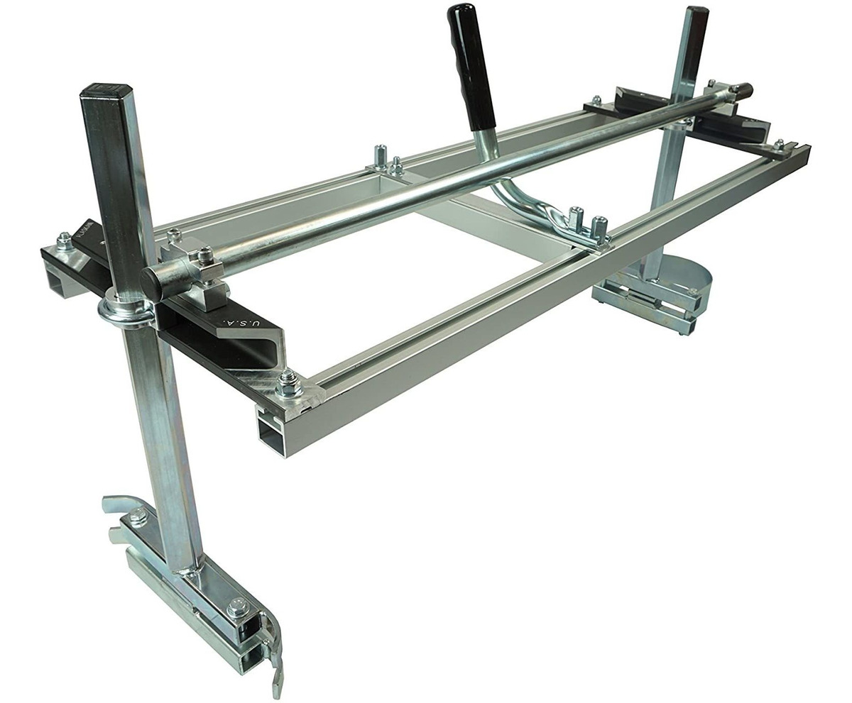 Diseñado y fabricado en los Estados Unidos.; Se puede montar con unos pocos giros de una llave inglesa.; Corta losas de pulgada a 13 pulgadas de grosor y hasta 27 pulgadas de ancho, donde el árbol cae.; Corta cedro, nogal y roble en maderas de alta calidad.; Construcción de acero y aluminio de calidad. his versatile, heavy-duty chainsaw lumber mill accurately cuts planks and beams up to 32 wide and 1/2 to 13 deep. Clamps onto your chainsaw bar with no drilling required. Lightweight and portable, enables user to mill lumber where the tree falls. No previous experience required! New CNC-Machined billet end brackets! (See photo) These new end brackets are more accurate, easier to adjust, create less vibration than the old die cast version and are virtually unbreakable. Perfect for homeowners, woodworkers, arborists and sawyers. Optimal results will be had when used in conjunction with Granberg ripping chain and first cut platforms.Basic Mill (G778) and 36-inch Handle and Rail Set (G781-36): Tubular Aircraft aluminum extrusion and zinc-plated steel parts. Instruction manual assembly hardware. High-quality U.S. made aircraft aluminum and steel. MADE IN THE USA Todos nuestros productos estan en inglés SKU 15092137832