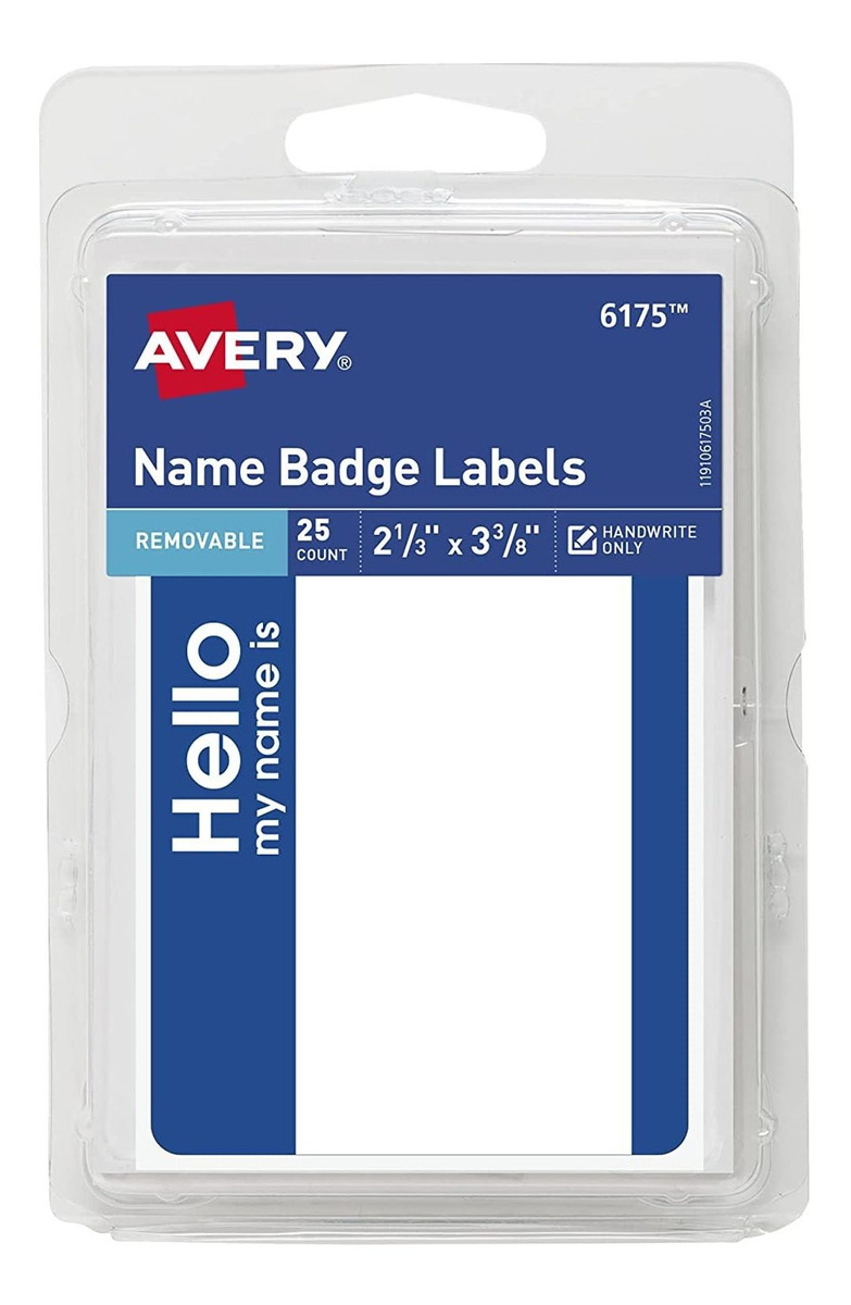 Las pegatinas originales Hello My Name son de Avery una gran manera de presentarse a los demás.; Ya sea que estés voluntando, en una llamada de reunión virtual, reuniendo nuevos compañeros de clase o colegas o usando uniforme médico y una máscara facial, estas pegatinas pueden ayudar a personalizar cualquier situación o evento ya sea en persona o en línea.; Para ayudar a mantener tu organización más segura, crea insignias de nombre bajo demanda para los empleados, visitantes y contratistas, personaliza fácilmente añadiendo pantalla, temperatura probada, y más.; Escribe a mano solo en hojas pequeñas.; Las etiquetas de nombre se adhieren firmemente a la mayoría de telas sin levantarse, rizarse o caerse; se mueve con la ropa para que tu etiqueta de nombre se mantenga limpia y presentable donde quiera que vayas. Ensure everyone knows your name, and you know theirs, at your next meeting, reunion, get-together or event with the original Avery Hello My Name Is adhesive name tags. These 2-1/3 x 3-3/8 name tags for clothes feature removable self-adhesive that allows labels to stick securely to most fabrics without curling, lifting or falling off, but is not recommended for use on delicate materials like corduroy, plastic, leather, silk, suede, velvet or vinyl. Add a personal touch to each name badge by hand using pen, pencil, marker or highlighter. These durable adhesive name labels are fantastic for corporate events, group meet-ups, holiday work parties, class reunions, bachelorette parties, bridal showers and more. Great for teachers, these versatile name badges are perfect to use as student name tags for classrooms, desk name tags, and name badge labels for parent-teacher conferences. Item comes with 25 individual blank name tags with the Hello My Name Is design and blue border. Todos nuestros productos estan en inglés SKU 91221057445