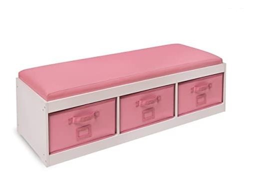 Una clase, banco durable y confortable, con compartimientos de almacenaje abajo y un cuero de imitación que cubre en el cojín para una fácil limpieza .; Bench soporta hasta 200 libras .; Los contenedores son completamente extraíble para su uso en cualquier lugar de la casa, y que se pliegan para un almacenamiento si no se utiliza .; Dimensionados para niños – medidas generales de la unidad: 45.25 pulgadas W x 15.75 pulgadas de profundidad x 13.75 pulgadas de H; El cojín superior está asegurado a un marco de madera fuerte, diseñado de modo que pueda ser levantada / eliminado como una tapa que permite la vista de todo dentro de todos los contenedores .; Limpiar y limpiar las manchas cuando sea necesario .; montaje por un adulto requiere Color: blanco / rosa