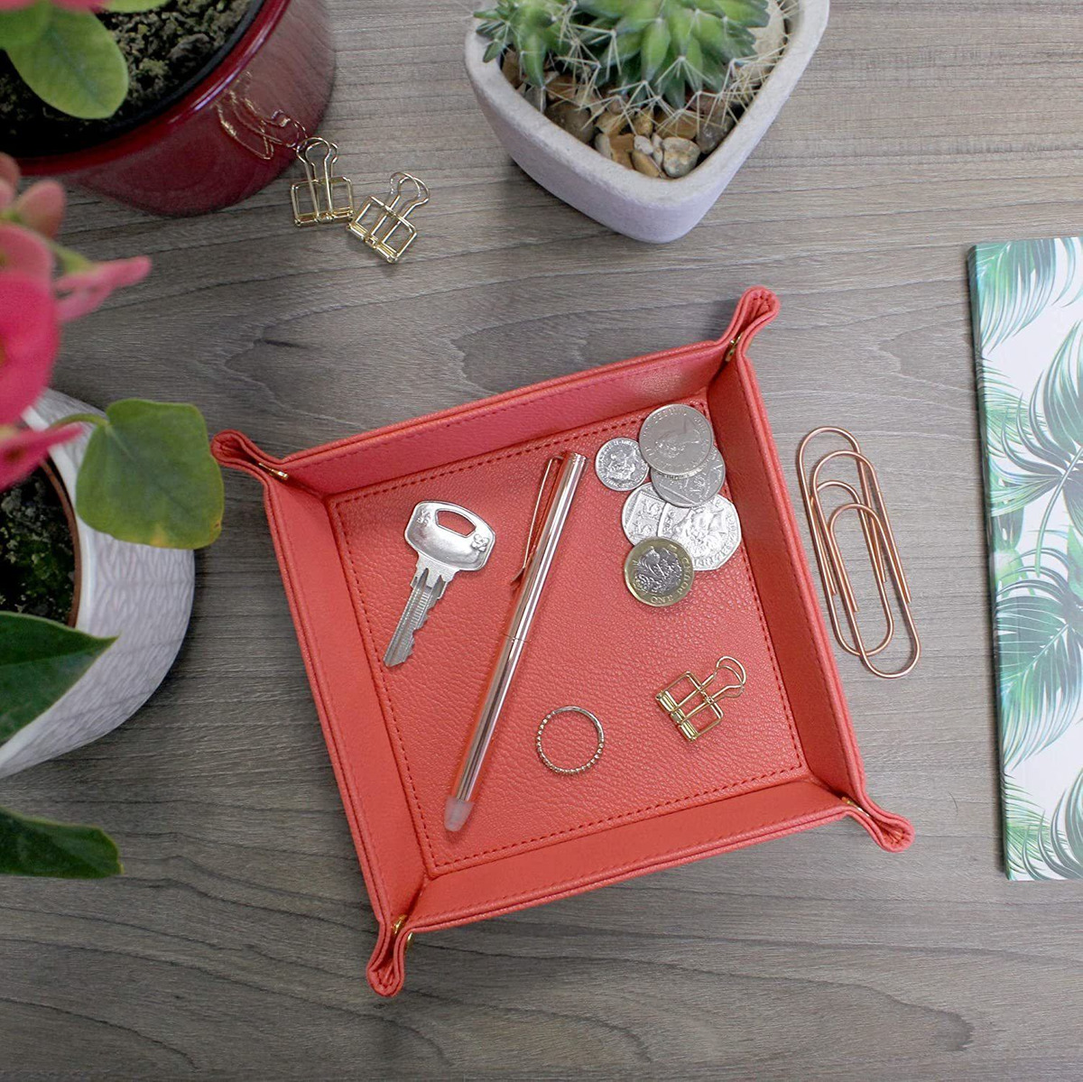 MUCHAS APLICACIONES: Esta bandeja con asistencia hecha a mano presenta una hermosa color del año de imitación de cuero y botones de juego perno prisionero del oro de coral. Nuestros materiales son de origen cuidadosamente para asegurar la mejor calidad que resista la prueba del tiempo. Un producto versátil que se puede utilizar como una bandeja de EDC, la captura de cabecera de todo, dados bandeja también hace un accesorio perfecto para cualquier habitación, como un soporte de reloj en su pasillo o adición elegante a cualquier habitación .; PERFECTO TAMAÑO: Premium broche de cierre se desenganche de diseño y colapsa para viajar, que mide 5,25 x 5,25 x 1,25 pulgadas cuando está montado y es el tamaño perfecto para su cuarto de baño, cocina, oficina o escritorio de la escuela .; DEBE TENER ACCESORIOS :: Ideal para la organización y el almacenamiento de monedas sueltas, gemelos, relojes, teléfonos, pequeños accesorios, etc. Proporciona un cajón de sastre ideal cuando se vacía el bolsillo o bolsa; Perfecto para dar: para él o ella – Estos elementos esenciales de lujo hacen un regalo ideal para celebrar un nuevo trabajo, cumpleaños, San Valentín, retiro, graduación, día de padres, día de madres o llenador de la media en Navidad .; Nuestra promesa: Somos positivos que le encantará nuestros productos, pero si no lo hace por alguna razón la calidad, que reemplazará o reembolso por hasta 30 días después de la compra. Nuestro amable equipo de atención al cliente está siempre disponible para responder a cualquier pregunta que pueda tener. Todos nuestros productos estan en inglés SKU 6102019995