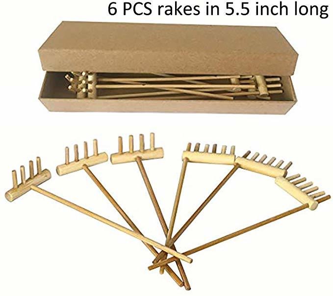 El conjunto de 6 rastrillos mini-jardín zen que están hechas de bambú de la naturaleza .; Están en 15cm (5.5inch) de largo. Es buen tamaño para mini jardín zen mesa .; 3pcs tradicional de cuatro dientes rastrillos para usted para hacer la ola, la ruta y patrón diferente en la arena .; 3pcs hilado rastrillos para circular y semi-círculo. Usted puede disfrutar del jardín bandeja de arena con sus amigos juntos .; Con caja stroage para sostenerlos mientras no se utiliza. Todos nuestros productos estan en inglés SKU 5121919039