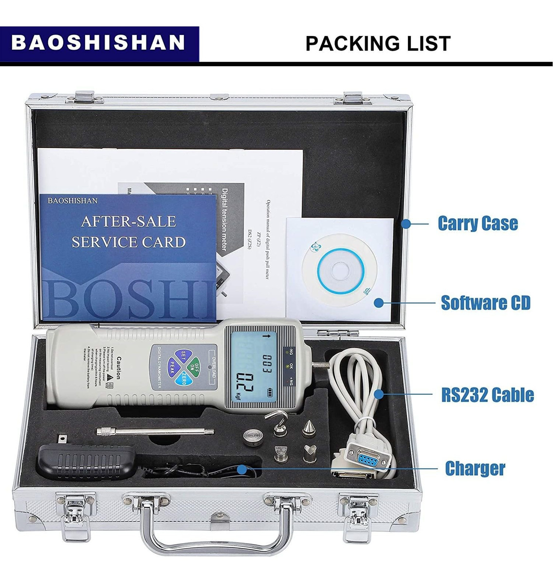 DATOS DE ALMACENAMIENTO Y SALIDA – Este medidor digital de escala de fuerza pueden almacenar hasta 999 datos de medición, y directamente pueden ver los datos históricos en la pantalla LCD retroiluminada. También puede conectar los datos a un ordenador mediante un cable RS-232 para su análisis. Proporcionamos software libre para exportar los datos .; VARIOS ACCESORIOS – HJJ-001 abrazadera 1, las piezas de prueba de presión 4, Tenslie parte prueba 1, Amplia eje 1, que son capaces de satisfacer la mayoría de los requisitos experimentales. El dinamómetro digital portátil y varios accesorios se pueden poner en la caja de transporte para un almacenamiento cómodo y llevar .; Para prueba de tracción – El banco de pruebas de tensión está especialmente equipado para DL, serie ZP de medidor de fuerza de tracción de empuje (no incluido), que se pueden combinar a un instrumento de prueba para diferentes efectos de los ensayos de tensión .; ZP-500N PARÁMETROS – Capacidad: 500 N / 110lbf / 50kgf (tres unidades) | Resolución: 0,1 N / 0.1lbf / 0.01Kgf | Precisión: 0,2% | Velocidad de transmisión: 2400sps | velocidad de muestreo: 1000 veces / seg | Peso neto: 520g | Un año de garantía y soporte técnico profesional; Aplicación – El banco de pruebas de tracción es ampliamente utilizado en caucho y plásticos, industria ligera, textiles, la construcción de puertas y ventanas, materiales compuestos, industrias de alambres y cables, y los experimentos de tracción. BAOSHISHAN APW prueba del soporte ZP-500N Digital Force Gauge