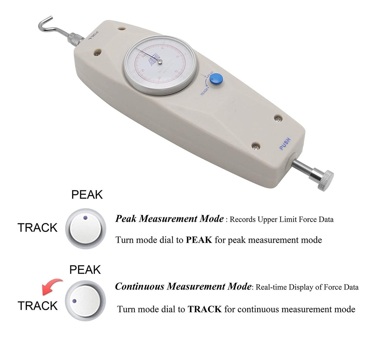 PARÁMETRO – Unidad: N / kg (sin conversión de unidad) | Capacidad: 500 N | Resolución: 2,5 N | Carrera: 0.394 en | Precisión: 1% | También TENEMOS Serie DL (ASIN: B015WK5U8Y) Tipo de marcar con Unidad LB | Serie HP (ASIN: B07PKNWLRP) Tipo digitales con Unidad kgf, f lbb, N