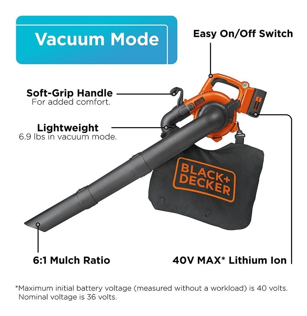 Power up your yard cleanup with the cordless BLACKDECKER 40-volt Lithium Sweeper/Vacuum (model LSWV36), which eliminates the weight, noise and hassles of gas-powered equipment. In addition to blowing debris, you can switch to vacuum mode to mulch leaves and more into its included half-bushel collection bag. Its powered by BLACKDECKERs high-powered 40-volt lithium battery system, which offers power, excellent runtime, and the versatility to share batteries with other tools within the system.