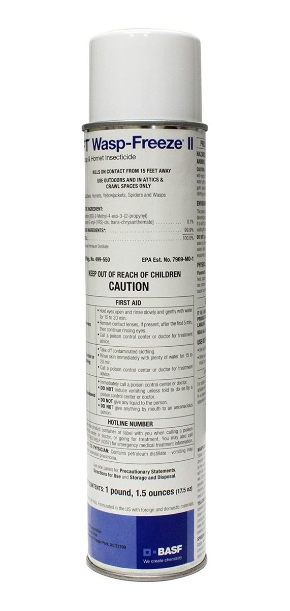 Lugares de uso: al aire libre en una variedad de insectos voladores, incluyendo abejas, avispas, abejorros y amarillos; también etiquetado para arañas; Ingrediente activo: d-trans allethrin y fenotrrina; Pulveriza desde 14.8 ft de distancia.; Peso del paquete: 18.4 lbs Prescription Treatment brand Wasp-Freeze Wasp Hornet Killer produces