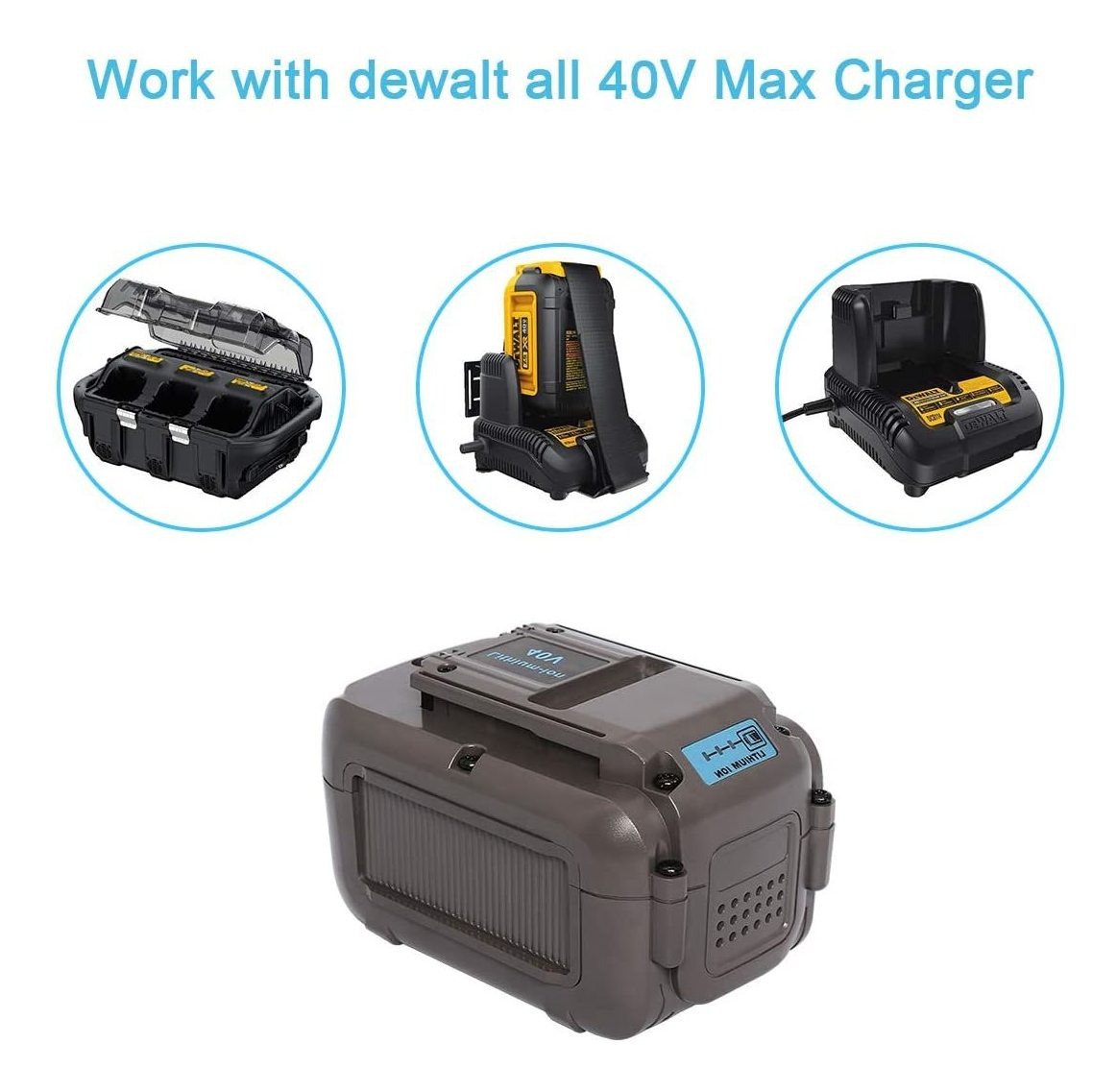 Esta batería de repuesto de 40 V 7.5 AH para todas las baterías Dewalt 40 V, y es compatible con todas las herramientas y cargadores Dewalt 40 V Max.