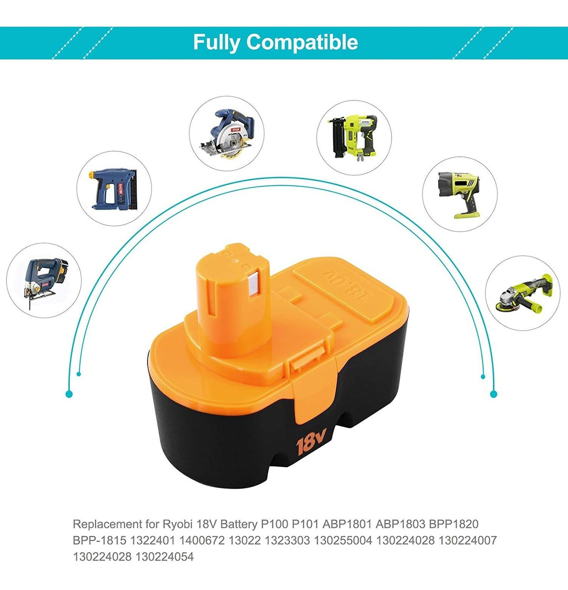 Capacidad de la Batería: 3000 mAh. Tipo de Batería: Ni-MH. Voltaje de la Batería: 18 voltios. Potencia: 54 Wh; Batería de repuesto para Ryobi 18 V P100 P101 ABP1801 ABP1803 BPP1820 BPP-1815 1322401 1400672 13022 1323303 130255004 13024024024024024024024024024024024024024024024024024 8 130 224007 130224028 130224054; Perfecto con compatible TODAS LAS Herramientas eléctricas Inalámbricas Ryobi de 18 V (el modelo de un juego, consulta la Descripción), y AJUSTE para cargador Ryobi P117; Estas Baterías Tienen Protecciones Integradas para Proteger La Batería y del Cargador del sobrecalentamiento, sobrecarga y cortocircuito. En comparacion con el NI-CD, el Rendimiento de la Batería Ni-MH es mas estable, Más respetuoso con el Medio Ambiente, Vida Útil Más Larga .; Sin efecto memoria. Se Puede cargar o descargar SEGÚN mar necessary pecado Pérdida de Capacidad. Celdas Integradas de Alta Calidad para proporcionar la ONU Rendimiento Optimizado y Protección de sobrecarga Mediante la Comunicación totales del Sistema Entre la Herramienta, La Batería y del Cargador. Especificaciones: