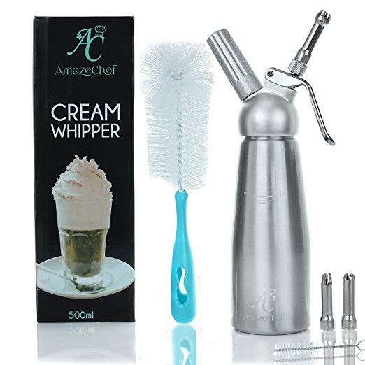 ¿ excepto tiempo y sin ensuciar HAZ: Hacer la crema batida fresca hecha en casa con esta batidora gourmet; cuencos no más desordenado y mezcladores necesarios! Sólo agrega algunos ingredientes en el recipiente, cargar con un cargador de 8 g (N2O) (no incluido), y agitar un par de veces; ¿ alta calidad y libre de fugas: Hecho con dispensador de acero de aluminio y la cabeza; INCLUYE 3 decorativo de acero inoxidable TIPS, lo que evita el desgaste; Mucho más robusto que puntas de plástico .; ¿ punto de bonificación: incluye dos cepillos de limpieza; para el dispensador y por los consejos de decoración encanta? Lo regalo! El AmazeChef batidor de crema se envasa en una elegante caja de regalo exclusivo ¿ ahorrar dinero: Sea un barrista en el hogar; ¿ ALTERNATIVE medio ambiente: A diferencia de las latas de crema batida desechables, de Amazechef batidor de crema es reutilizable; De esta manera, uno de los muchos compromisos de Amazechef es nuestra promesa de reducir el impacto de las prácticas culinarias en el medio ambiente; ¿¿ RIESGO compra libre: Nos esforzamos por satisfacción del cliente 100%; Si usted no está completamente satisfecho con este producto, le devolveremos su dinero o Ofrecemos un reemplazo sin cargo; El producto tiene una garantía de 1 año tienda normal compró latas de crema batida se han sentado en el estante durante un período prolongado de tiempo, y se nota en el sabor. ¿Por qué pasar horas preparando deliciosos pasteles para los clientes o hacer agua la boca pasteles cuando la crema batida que encabeza no es hecho en casa así? Mucha gente ha ido su conjunto sólo vive comer crema batida de una lata, así que cuando prueban la frescura y la esponjosidad de crema batida casera que seguramente apreciarán la diferencia superior.