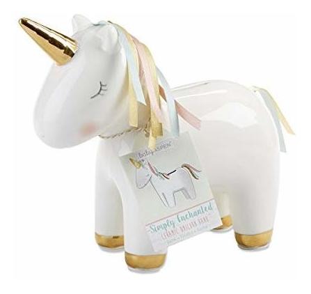 Un banco que no es sólo funcional pero hermoso es tan raro como, también, como un unicornio! Bebé Aspen ha combinado los dos para hacer un regalo único ducha de la niña. Nuestra cerámica Unicorn Banco es adecuado para el primer banco de moneda del bebé, sino que también es una hermosa pieza decorativa que puede iluminar su cuarto de niños. Características y hechos: Blanco banco unicornio cerámica está adornada con una lámina de oro cuerno y pezuñas, junto con una melena y la cola hecha de rosa, aguamarina y oro cintas Banco es sólo lavado a mano Medidas 8. 7″ WX 3. 5″ DX 8. 3″ h Todos nuestros productos estan en inglés SKU 5121933474