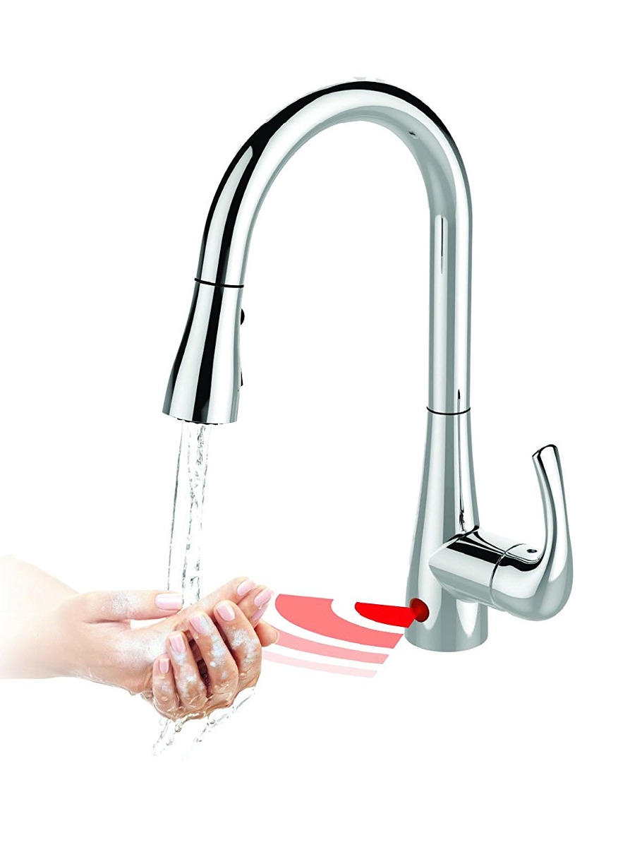 sensor de infrarrojos (con 2,5″ – 6,5 gama cm) se activar / desactivar de flujo con movimiento de la mano; Caño giratorio desplegable con el botón », pulsador desviador y 65″ pausa manguera flexible de nylon trenzada; rociador de mano se activará automáticamente cuando se tira de su alojamiento; El temporizador de seguridad se cerrará automáticamente el agua después de 3 minutos de inactividad; Garantia limitada de por vida Color: níquel cepillado Acabado